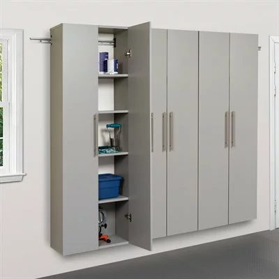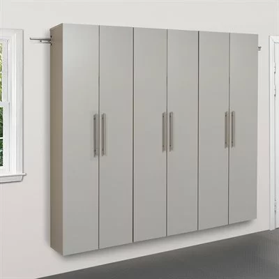 HangUps Set C 72-in 3-Piece Storage Cabinet Set The HangUps storage cabinet collection offers versatility for your ever changing storage needs in the garage, laundry room, office or workshop. These cabinets mount securely to the wall with a heavy duty metal rail and hook system. Add other cabinets from the HangUps collection to create a storage system to convert any cluttered room into an organized space. Ensures easy cleaning beneath the cabinets and protects your stored items from water and dirt Constructed using laminated composite wood Metal handles and adjustable hinges 31 cubic feet Light Gray laminate finish Satin nickel finished handles Ships ready-to-assemble Includes all hanging rails and fastening bolts Includes an instruction booklet for easy assembly Tools required for installation: drill, stud finder, level and tape measure (not included) Proudly Made in Canada Set C Includes: (3) 24-in Large Storage Cabinets Dimension: 24-in Width x 72-in Height x 12-in