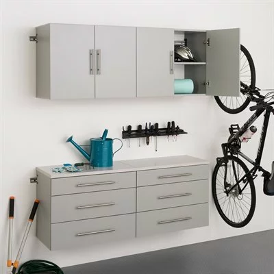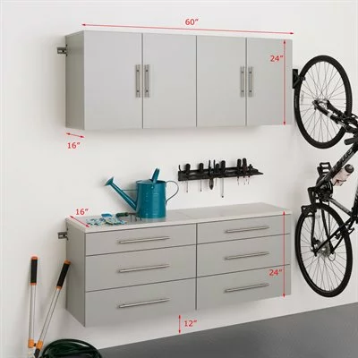 HangUps Set F 60-in 4-Piece Storage Cabinet Set The HangUps storage cabinet collection offers versatility for your ever changing storage needs in the garage, laundry room, office or workshop. These cabinets mount securely to the wall with a heavy duty metal rail and hook system. Add other cabinets from the HangUps collection to create a storage system to convert any cluttered room into an organized space. Ensures easy cleaning beneath the cabinets and protects your stored items from water and dirt Constructed using laminated composite wood Metal handles and adjustable hinges 22 cubic feet Light Gray laminate finish Satin nickel finished handles Ships ready-to-assemble Includes all hanging rails and fastening bolts Includes an instruction booklet for easy assembly Tools required for installation: drill, stud finder, level and tape measure (not included) Proudly Made in Canada Set F Includes: (2) 30-in Upper Storage Cabinet Dimension: 30-in Width x 24-in Height x 16-in