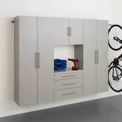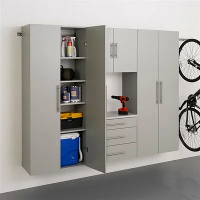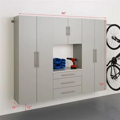 Add extra storage to your garage, laundry room or workshop with this cabinet system by Prepac®. This set features four wall-mounted cabinets and integrated shelving. Includes metal rail and hook system, hardware and instructions. Constructed using laminated composite wood. Ships ready-to-assemble. Easy assembly. Made in Canada. Tools required for installation: drill, stud finder, level and tape measure (not included). Set Includes: (1) 30-in Upper Storage Cabinet Dimensions: 30-in Width x 24-in Height x 16-in.