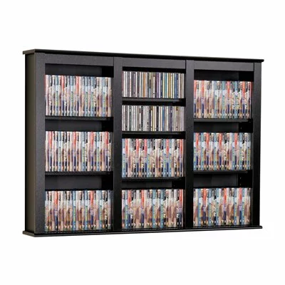 Triple Wall Mounted Multimedia Storage Limited space won’t limit your décor and storage options with the Triple Wall Mounted Storage shelf. Manage your large collection of CDs or DVDs with style and convenience by mounting this shelf on your wall. Installation’s a cinch at whatever height you choose, thanks to the innovative hanging rail system. Add storage without compromising floor space in this chic package. Finished in durable laminate Easy to install hanging rail system included Two or more units can be positioned side-by-side to increase storage Adjustable shelves hold a variety of media sizes Capacity: 523 CDs, 213 DVDs, 408 Blu-Ray discs, 124 VHS cassettes or any combination thereof Constructed from CARB-compliant, laminated composite woods with a sturdy MDF backer Ships ready to assemble, includes an instruction booklet for easy assembly Five-year manufacturer’s limited warranty on parts Proudly manufactured in North America