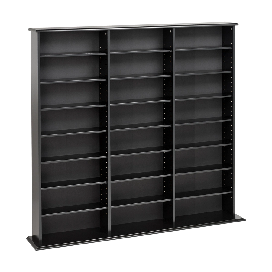 - Designed in a library style, this unit has three separate compartments, each with fully adjustable shelves that make storing a variety of media easy