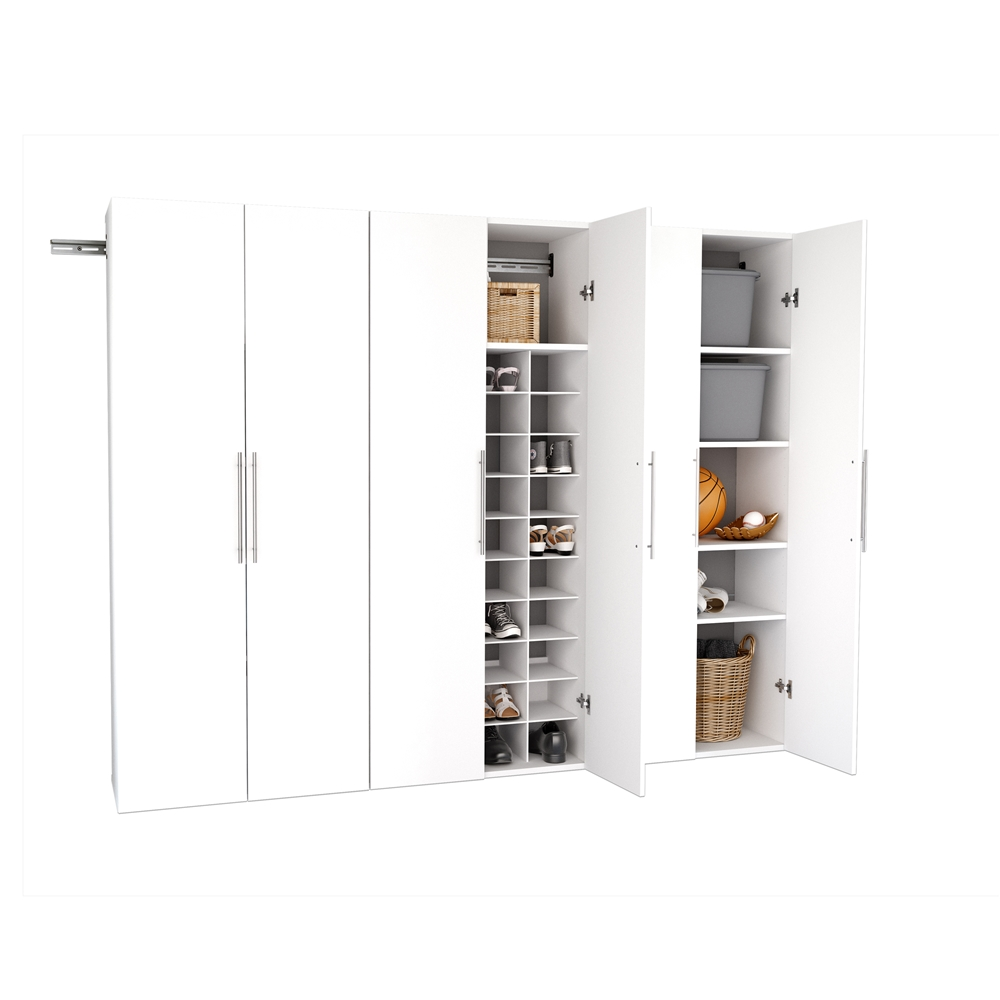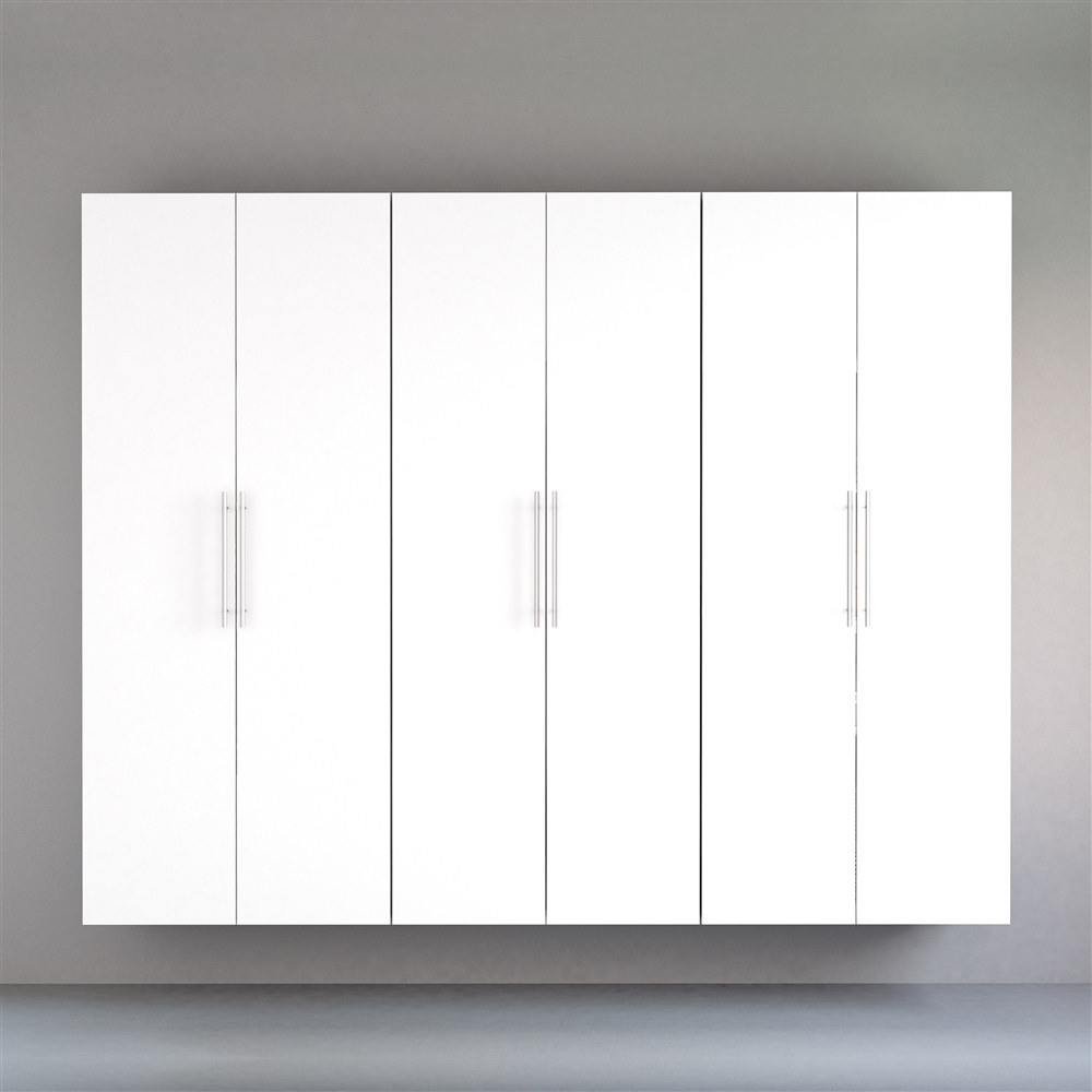The HangUps Storage Cabinet Collection by Prepac(R) offers versatility for your ever changing storage needs in the garage, laundry room, office or workshop. The Cabinets mount securely to the wall with a heavy duty metal rail and hook system. The wall mounted feature ensures easy cleaning beneath the cabinets and protects your stored items from water & dirt. The HangUps Collection by Prepac(R) is constructed using laminated composite wood and features metal handles and adjustable hinges. This product ships ready-to-assemble and includes all hanging rails and fastening bolts. Add other cabinets from our HangUps Collection by Prepac(R) to create a storage system to convert any cluttered room into an organized space. Set Includes: 1 x 30″”w x 72″”h x 16″”d Shoe Storage Cabinet, 2 x 30″”w x 72″”h x 16″”d Storage Cabinet