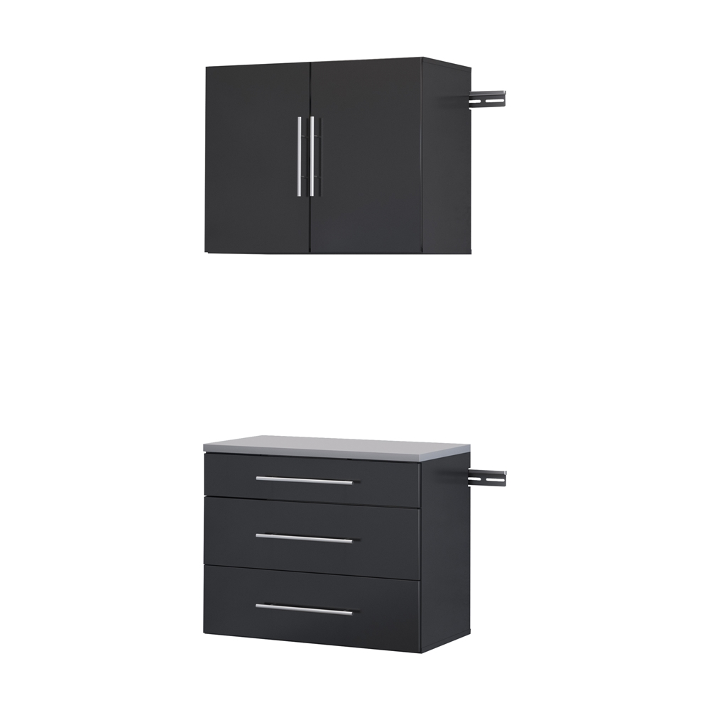 The HangUps storage cabinet collection offers versatility for your ever-changing storage needs in the garage, laundry room, office or workshop. The cabinets mount securely to the wall with a heavy-duty metal rail and hook system. The wall mounted feature ensures easy cleaning beneath the cabinets and protects your stored items from water and dirt. The HangUps collection is constructed using laminated composite wood and features metal handles and adjustable hinges.