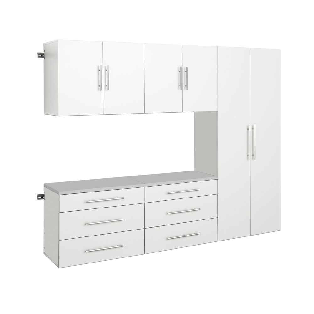 The HangUps Storage Cabinet Collection by Prepac(R) offers versatility for your ever changing storage needs in the garage, laundry room, office or workshop. The Cabinets mount securely to the wall with a heavy duty metal rail and hook system. The wall mounted feature ensures easy cleaning beneath the cabinets and protects your stored items from water & dirt. The HangUps Collection by Prepac(R) is constructed using laminated composite wood and features metal handles and adjustable hinges. This product ships ready-to-assemble and includes all hanging rails and fastening bolts. Add other cabinets from our HangUps Collection by Prepac(R) to create a storage system to convert any cluttered room into an organized space. Set H Includes: