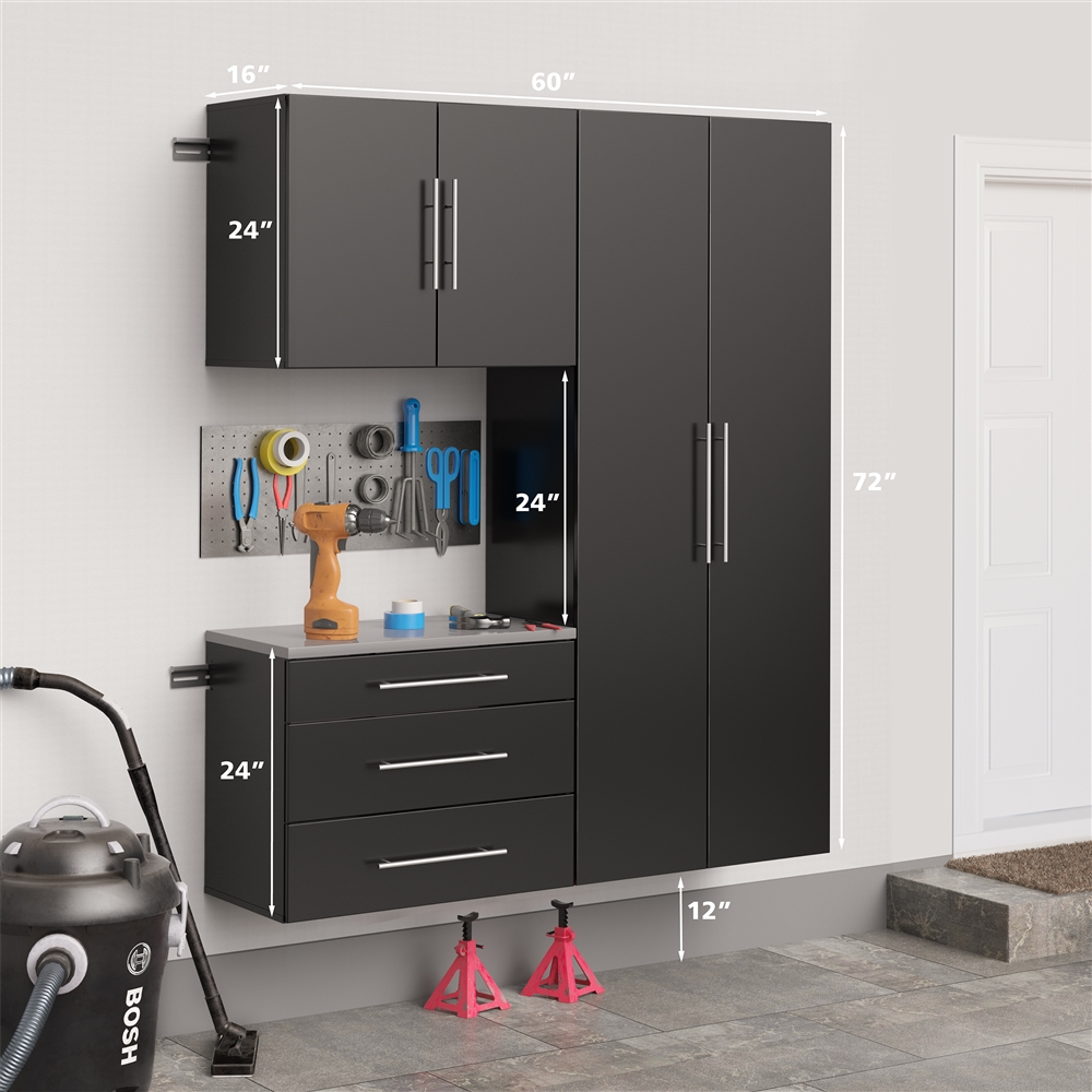The HangUps storage cabinet collection offers versatility for your ever-changing storage needs in the garage, laundry room, office or workshop. The cabinets mount securely to the wall with a heavy-duty metal rail and hook system. The wall mounted feature ensures easy cleaning beneath the cabinets and protects your stored items from water and dirt. The HangUps collection is constructed using laminated composite wood and features metal handles and adjustable hinges.