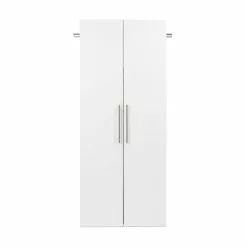 The HangUps 30″” Shoe Storage Cabinet offers versatility for your ever changing storage needs in the garage, laundry room, office or workshop. This cabinet mounts securely to the wall with a heavy duty metal rail and hook system. The wall mounted feature ensures easy cleaning beneath the cabinets and protects your stored items from water & dirt. The shoe storage cabinet features 40 individual shoe cubbies, with each cubby spacious enough to hold a pair of size 13 men’s shoes, keeping them neatly stored behind the two doors. Place larger items in the two shelves at the top of the cabinet. The HangUps Collection by Prepac(R) is constructed using laminated composite wood and features metal handles and adjustable hinges. This product ships ready-to-assemble and includes all hanging rails and fastening bolts. Add other cabinets from our HangUps Collection by Prepac(R) to create a storage system to convert any cluttered room into an organized space.