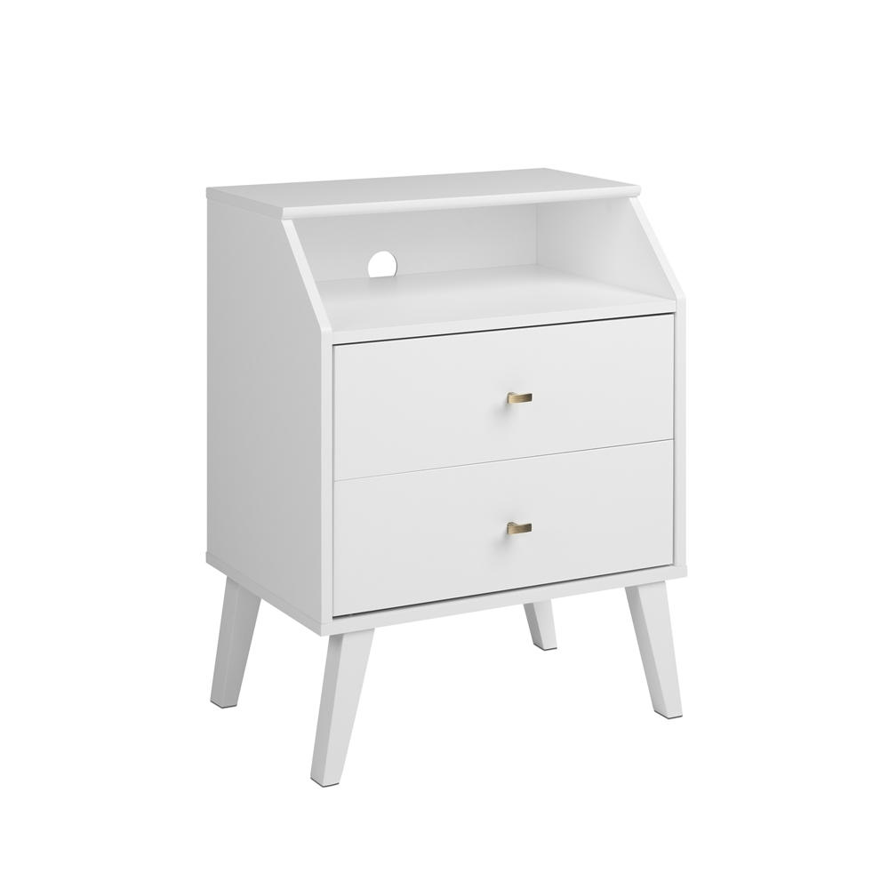 With a mid-century modern aesthetic, the Milo nighstand by Prepac(R) evokes a cool retro vibe. The two-tiered top shelf provides more space for tabletop items like your phone, lamp, clock and your favorite book. The main shelf features cable management for your electronic devices while the two drawers provide ample storage for bedside essentials. The tapered solid wood legs and inset drawers deliver a clean and modern look to your bedroom. Brushed brass finished knobs add to the retro-chic design for a functional and fashionable dresser. Style this dresser on its own, or combine it with any of the products in the Milo collection for a timeless look.