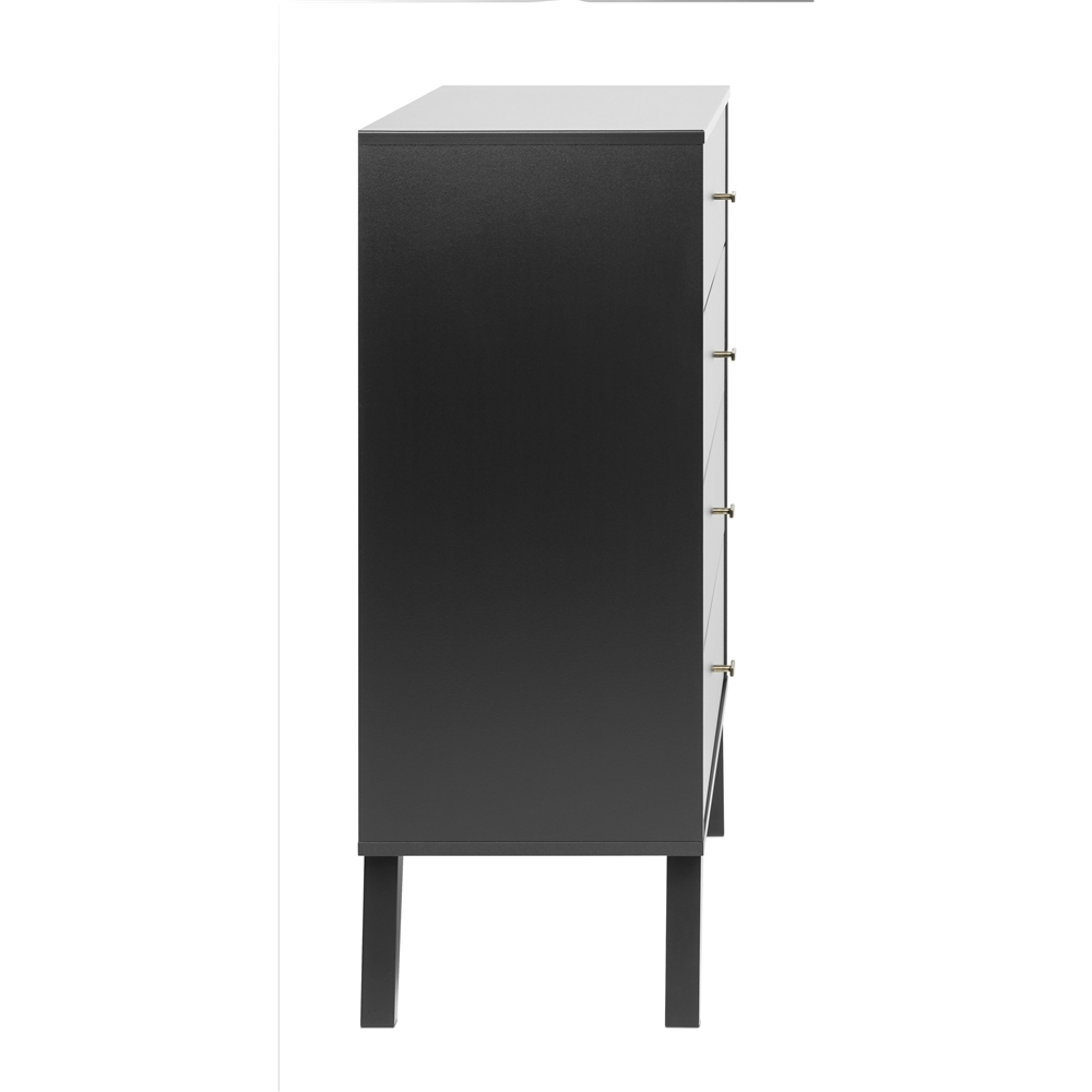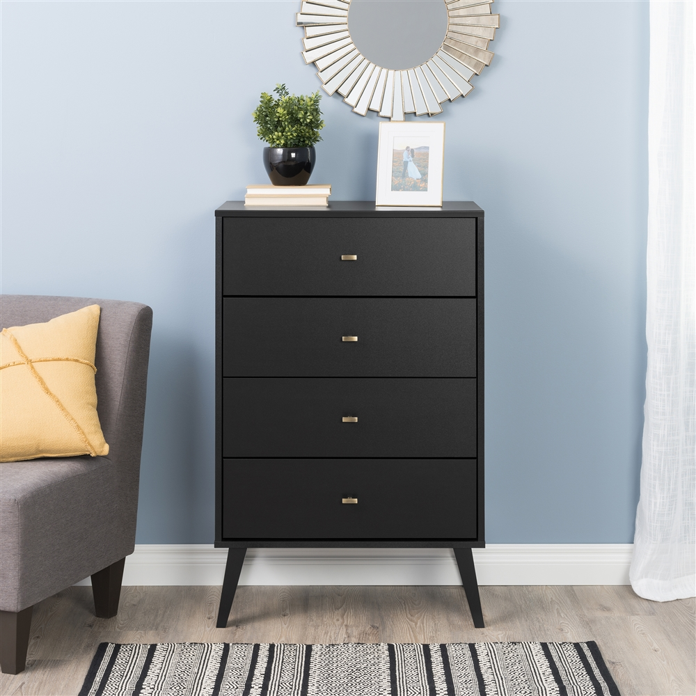The Prepac Milo 4 drawer dresser is a modern take on a retro look, with a sleek mid-century modern design that adds a touch of vintage styling to your bedroom. Four drawers run smoothly on metal glides, offering easy access to storage for clothing and bedroom items, all in a compact footprint for any bedroom size. The tapered solid wood legs and inset drawers deliver a clean and modern look to your bedroom. Brushed brass finished knobs add to the retro-chic design of this functional and fashionable dresser. Style this dresser on its own, or combine it with any of the products in the Milo collection for a timeless look. Ships Ready to Assemble, includes an instruction booklet for easy assembly. Manufactured in Canada and meets all North American safety standards. 5-year manufacturer’s limited parts warranty.
