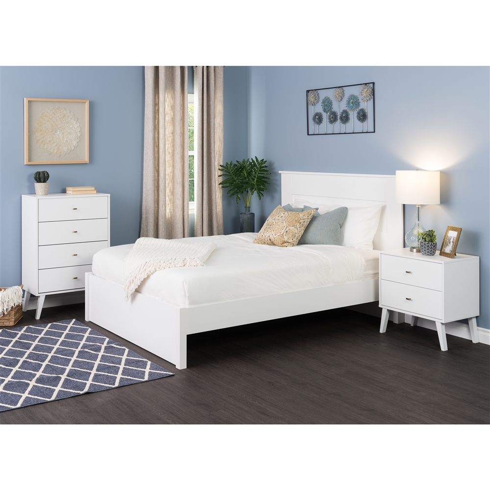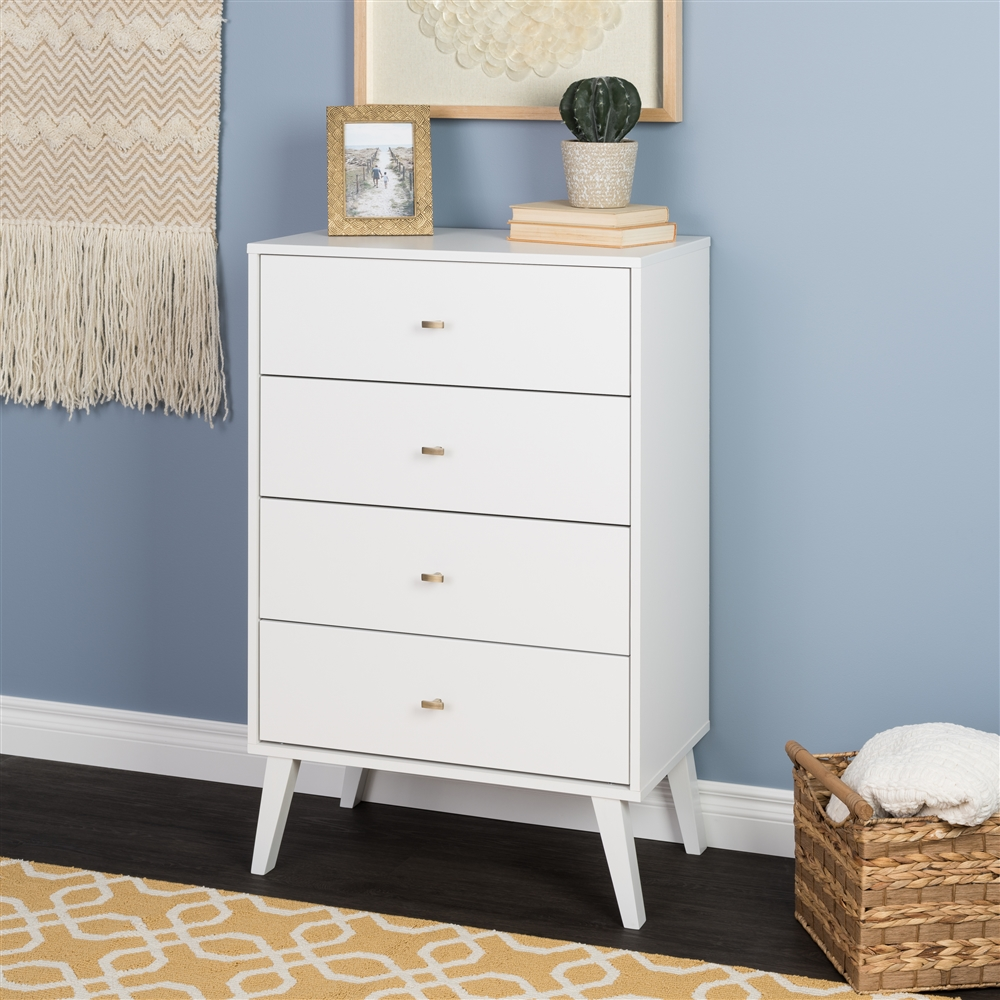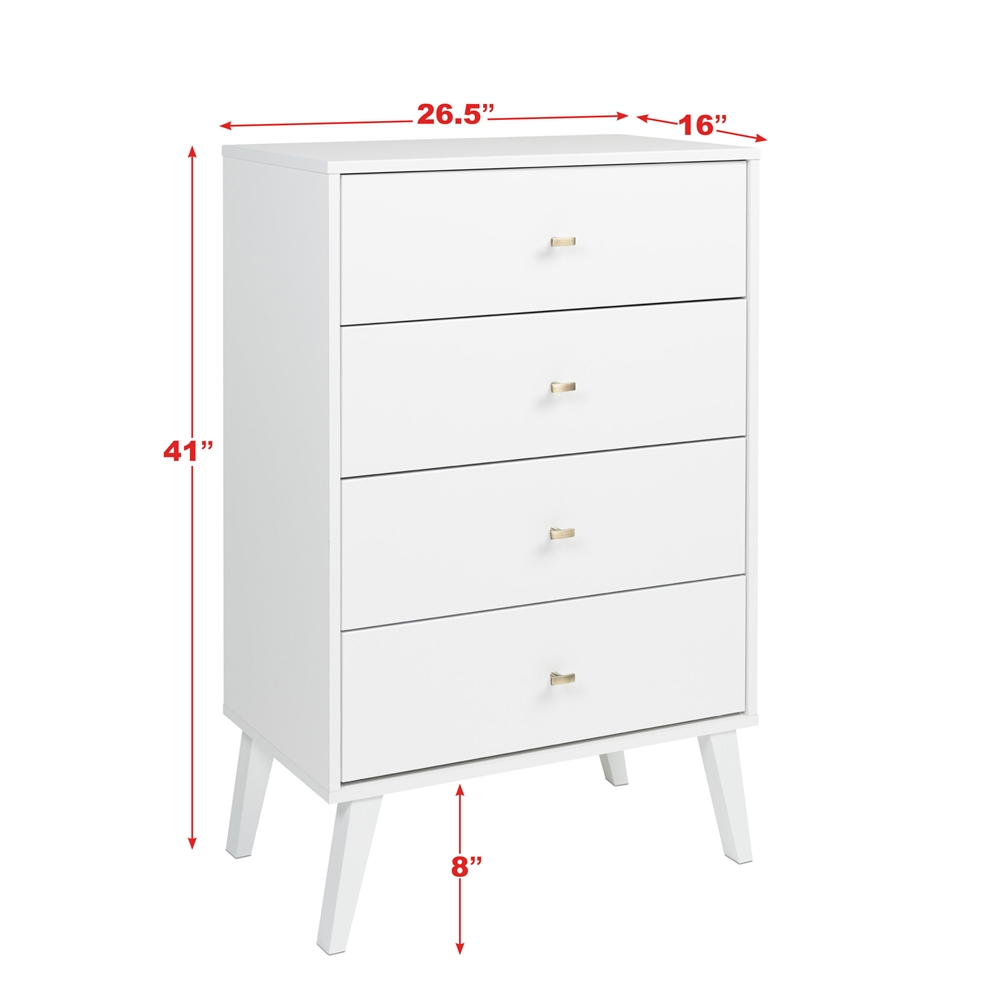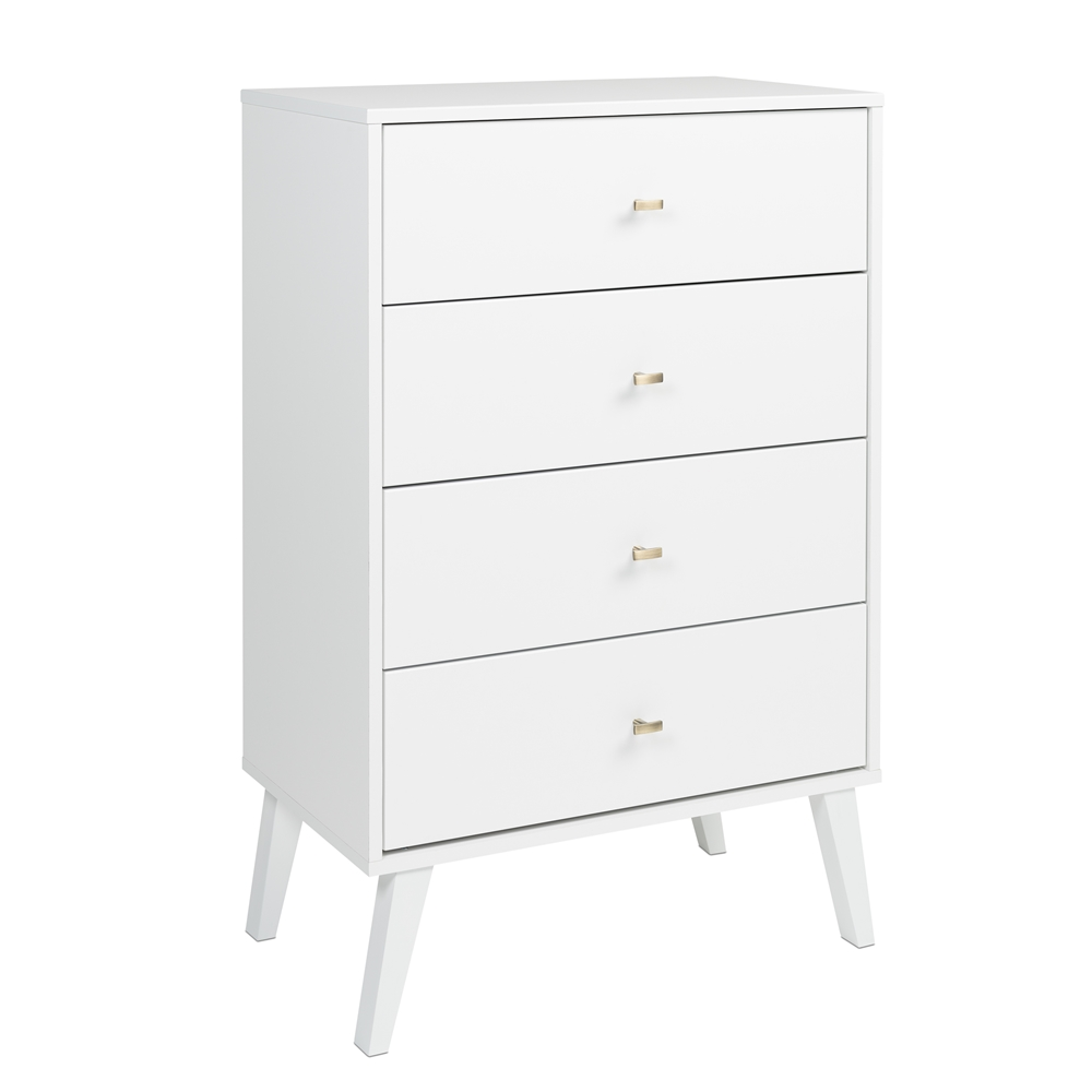 The Prepac Milo 4 drawer dresser is a modern take on a retro look, with a sleek mid-century modern design that adds a touch of vintage styling to your bedroom. Four drawers run smoothly on metal glides, offering easy access to storage for clothing and bedroom items, all in a compact footprint for any bedroom size. The tapered solid wood legs and inset drawers deliver a clean and modern look to your bedroom. Brushed brass finished knobs add to the retro-chic design of this functional and fashionable dresser. Style this dresser on its own, or combine it with any of the products in the Milo collection for a timeless look. Ships Ready to Assemble, includes an instruction booklet for easy assembly. Manufactured in Canada and meets all North American safety standards. 5-year manufacturer’s limited parts warranty.