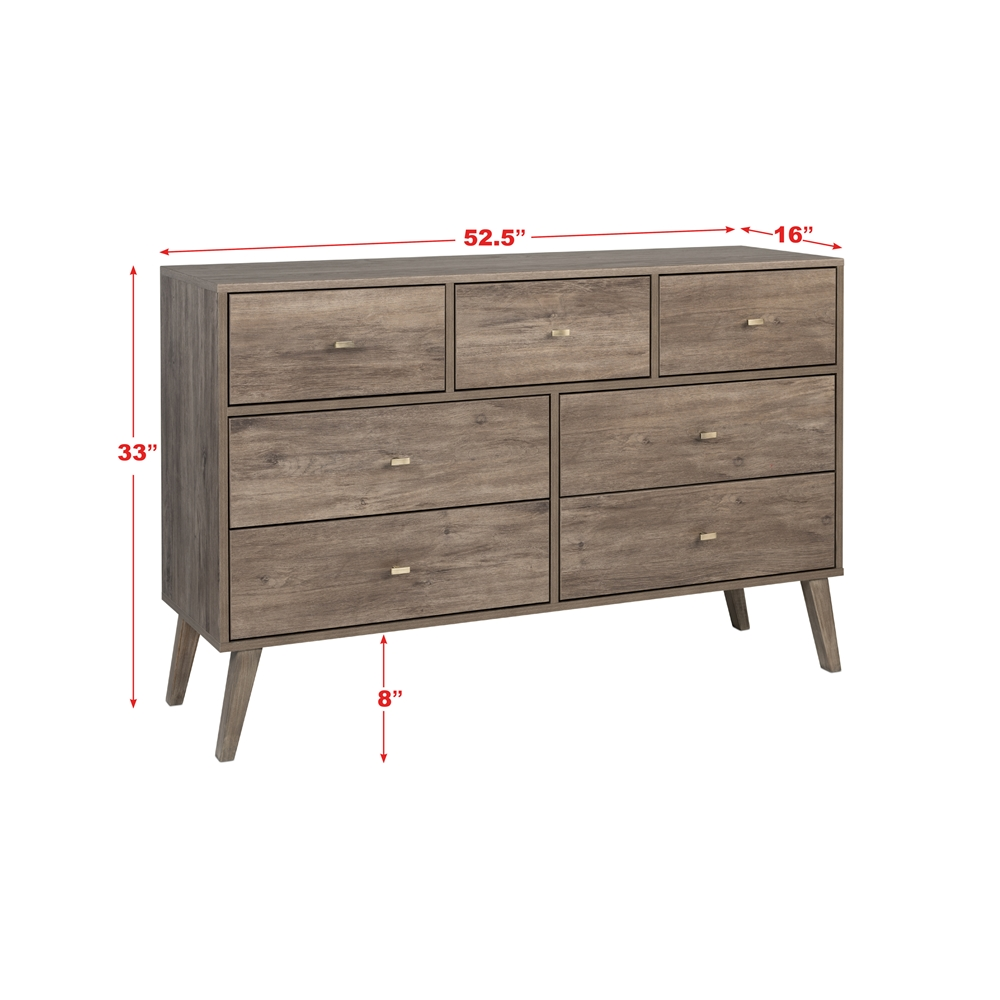 The Prepac(R) Milo 7-drawer dresser is a modern take on a retro look, with a sleek mid-century modern design that adds a touch of vintage to your bedroom. Three small drawers on the top row are well suited for personal clothing, while the 4 large lower drawers have ample room for sweaters and larger items. All seven drawers run smoothly on metal glides, offering easy access to storage for clothing and bedroom items. The tapered solid wood legs and inset drawers deliver a clean and modern look to your bedroom. Brushed brass finished knobs add to the retro-chic design for a functional and fashionable dresser. Style this dresser on its own, or combine it with any of the products in the Milo collection for a timeless look.