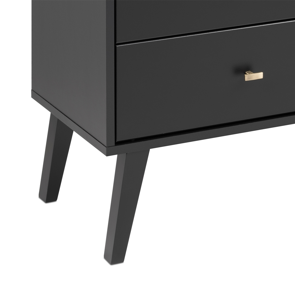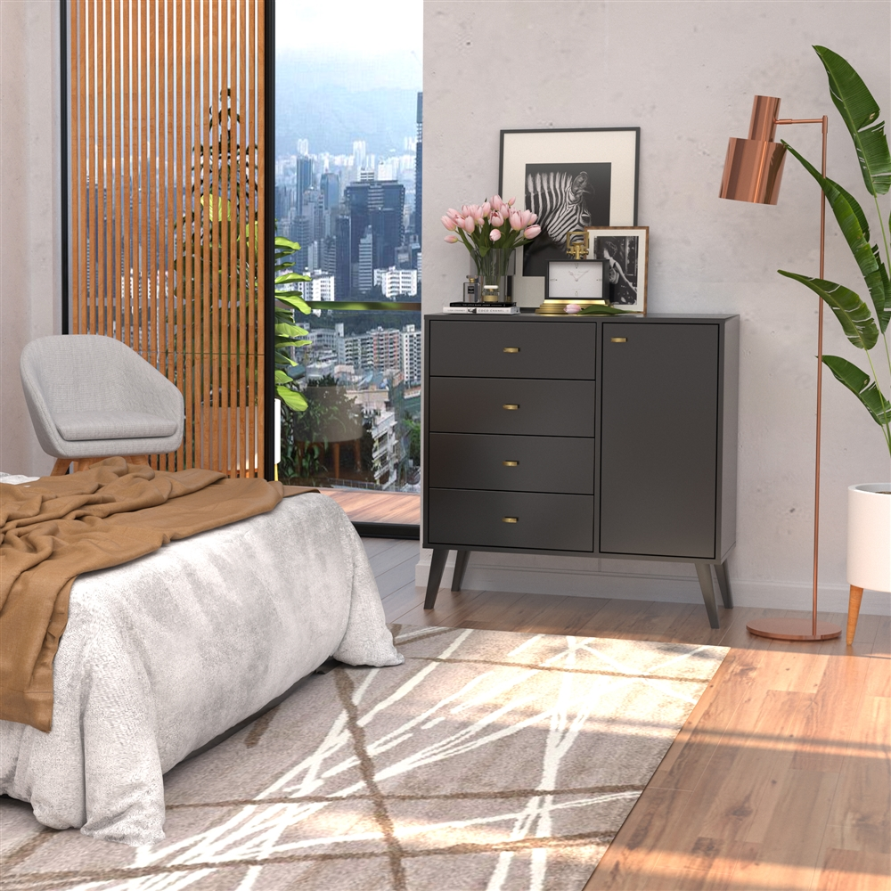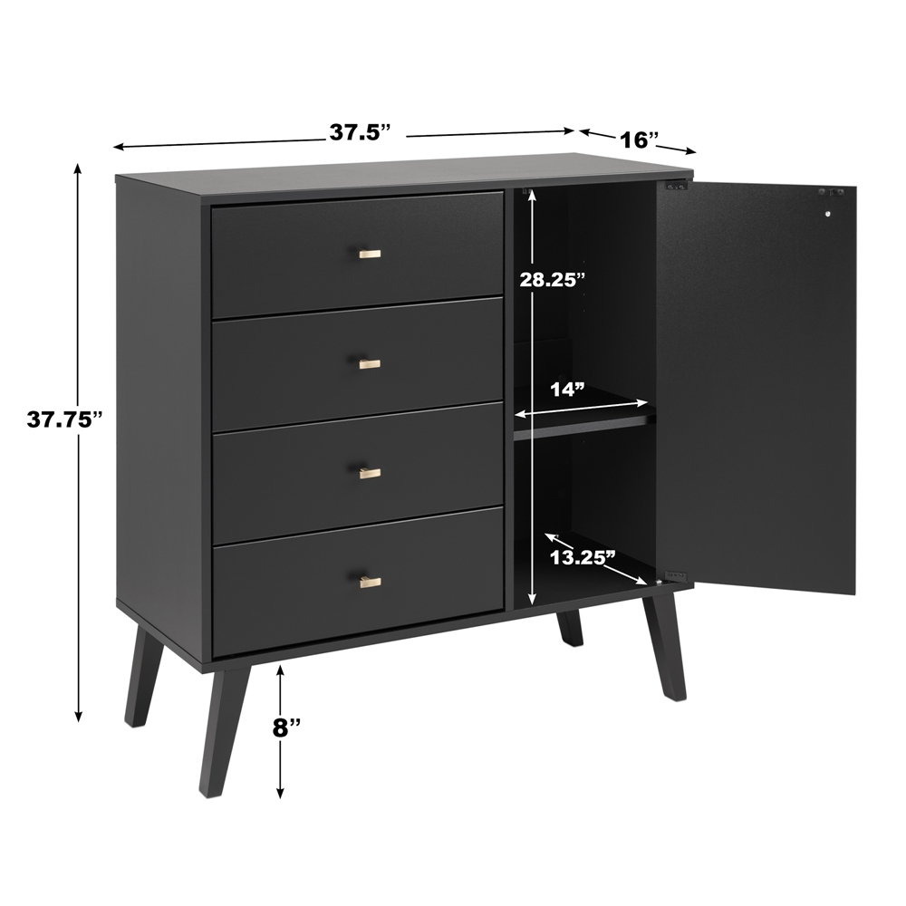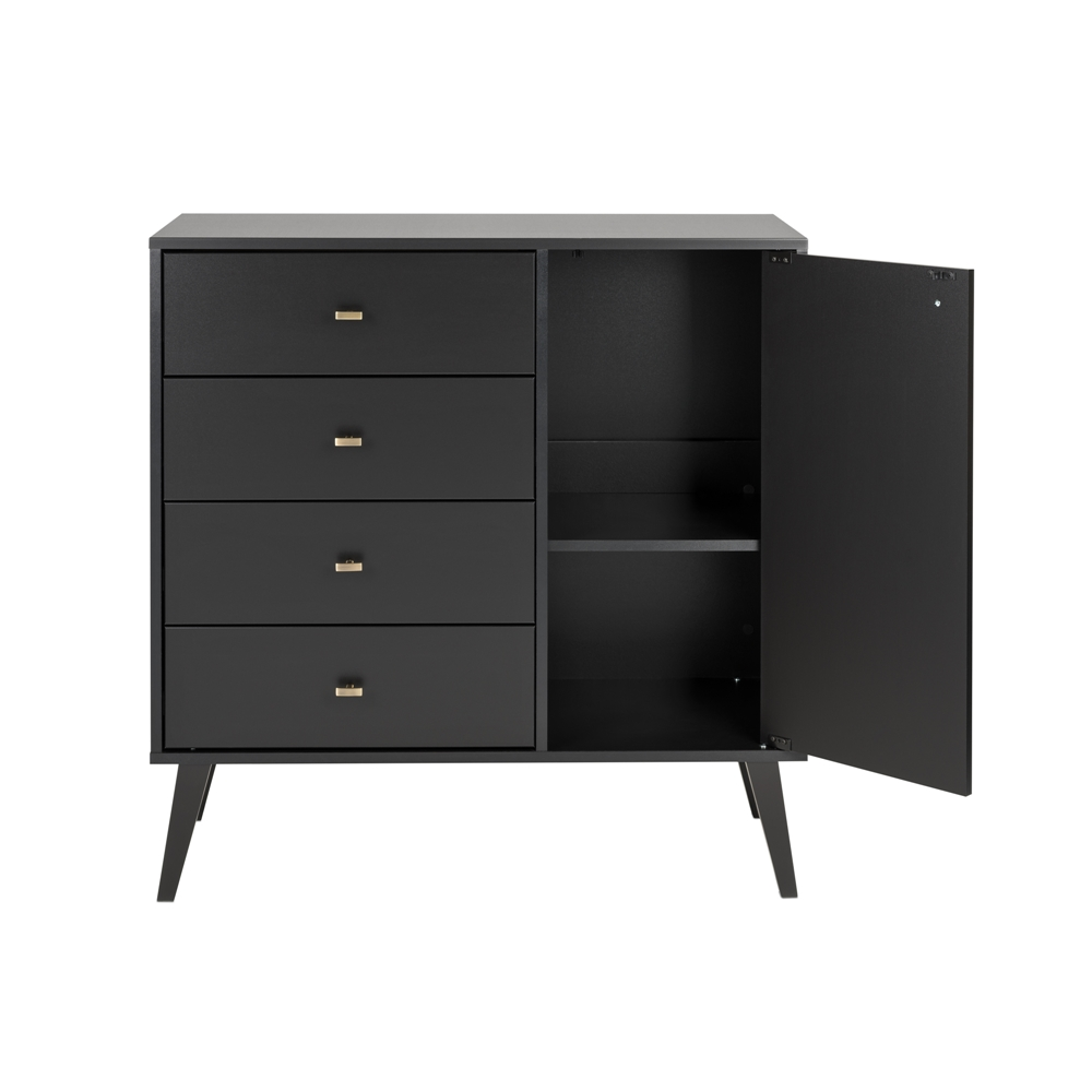 The Prepac Milo 4-drawer chest with door is a modern take on a retro look, with a sleek mid-century modern design that adds a touch of vintage to your home. This space-saving product is a great addition to any small space. In your bedroom or guestroom, the compartment with adjustable shelf is ideal for organizing anything from linens, blankets and pillows to hats, bags and games. Or use it in your dining or living space as a buffet to showcase your decorative accents and serving ware. Four drawers run smoothly on metal glides, offering easy organization for clothing or tabletop linens. The tapered solid wood legs and inset drawers deliver a clean and modern look. Brushed brass finished knobs add to the retro-chic design for a functional and fashionable cabinet. Style on its own, or combine it with any of the products in the Milo collection for a timeless look.