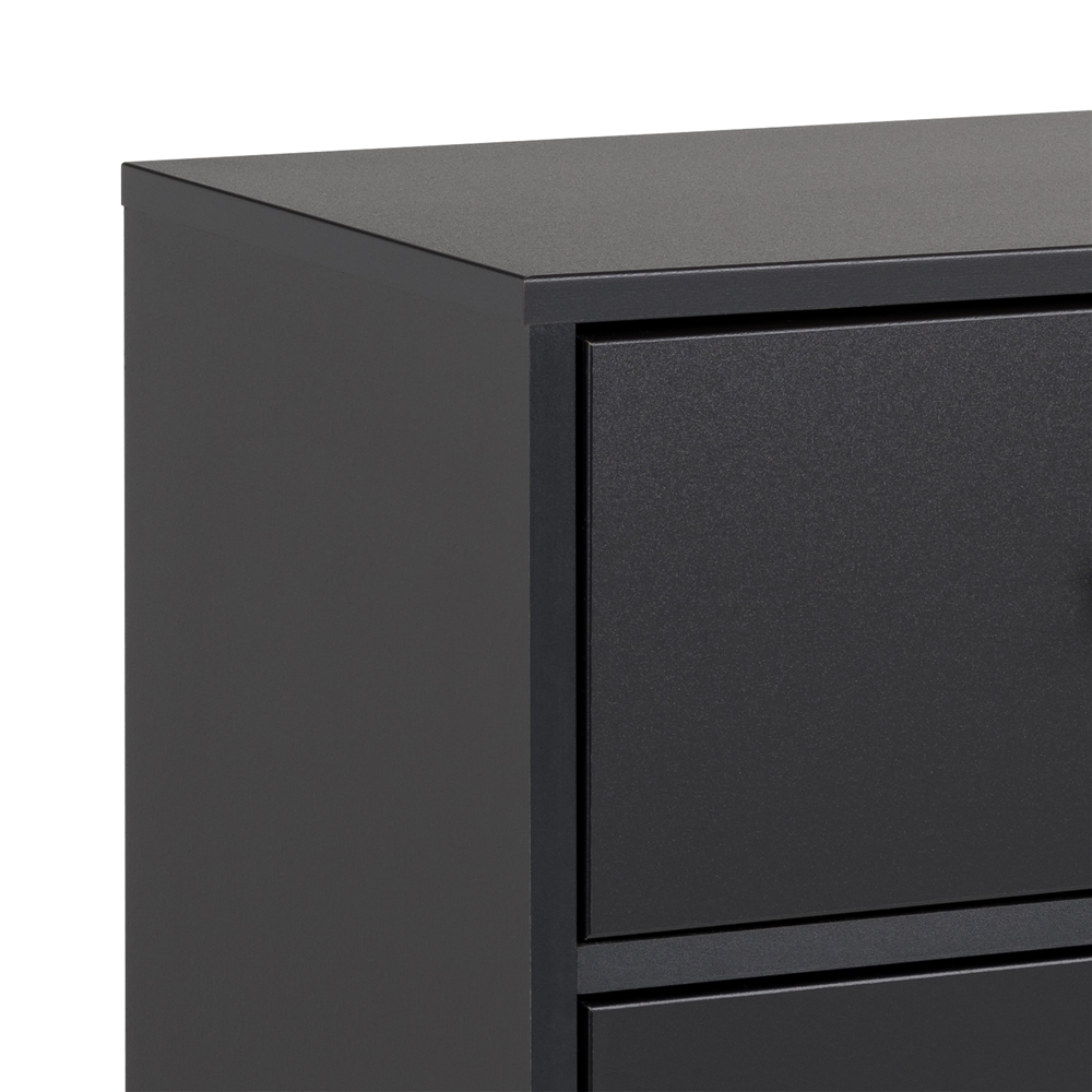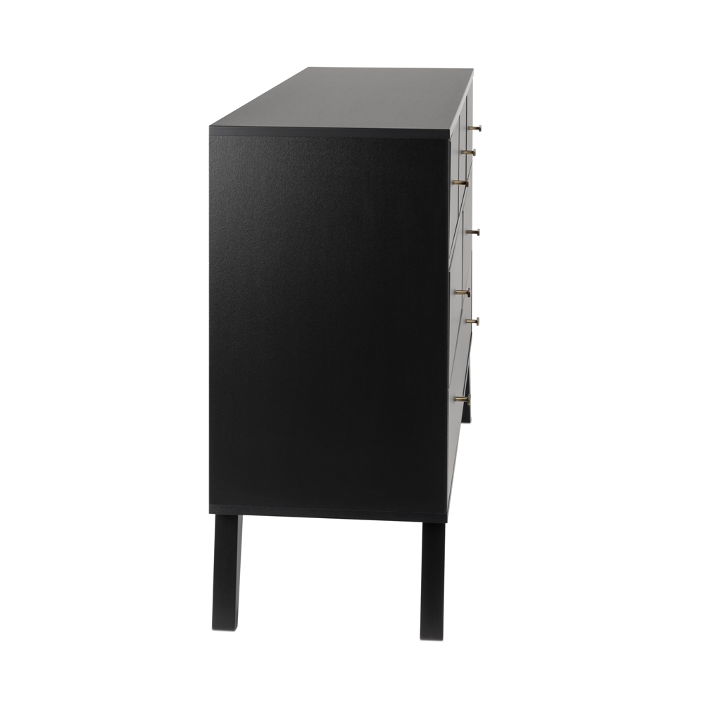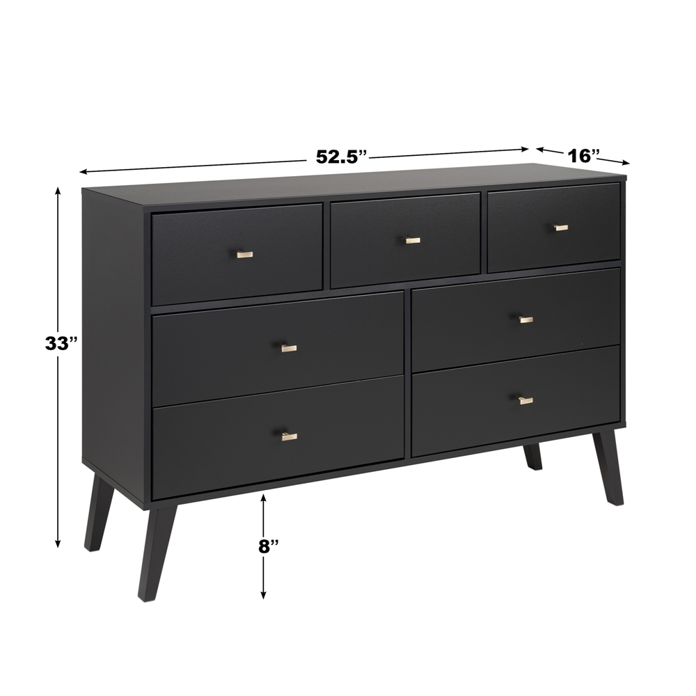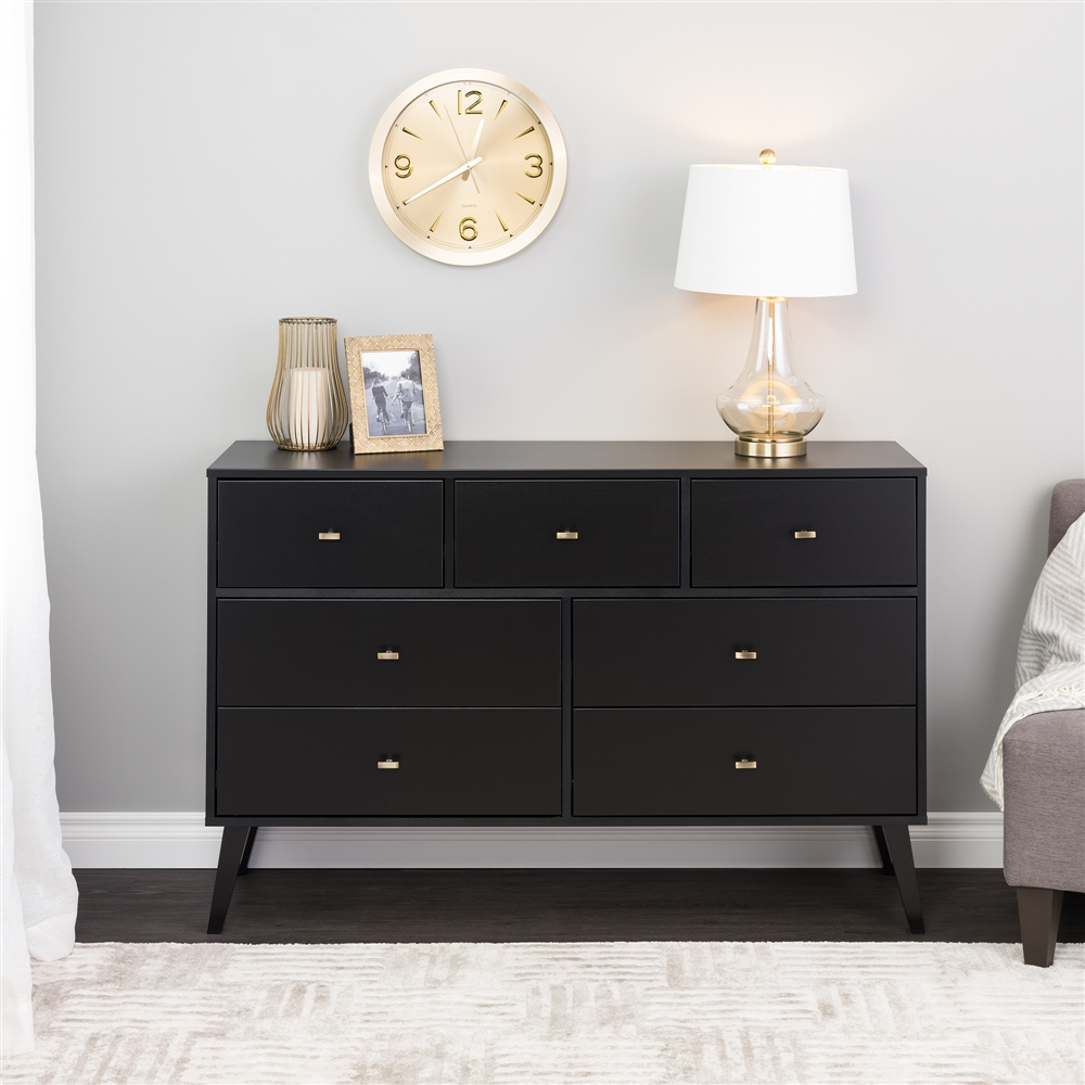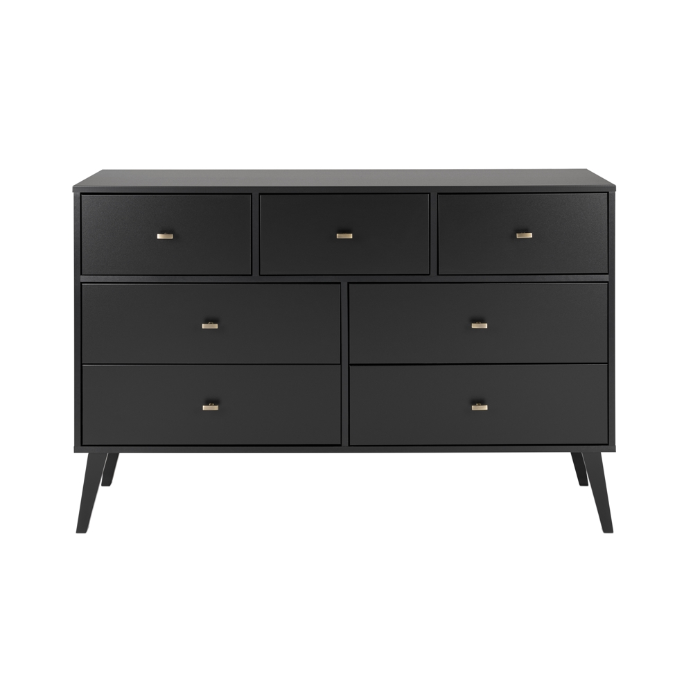 The Prepac Milo 7-drawer dresser is a modern take on a retro look, with a sleek mid-century modern design that adds a touch of vintage to your bedroom. Three small drawers on the top row are well suited for personal clothing, while the 4 large lower drawers have ample room for sweaters and larger items. All seven drawers run smoothly on metal glides, offering easy access to storage for clothing and bedroom items. The tapered solid wood legs and inset drawers deliver a clean and modern look to your bedroom. Brushed brass finished knobs add to the retro-chic design for a functional and fashionable dresser. Style this dresser on its own, or combine it with any of the products in the Milo collection for a timeless look.