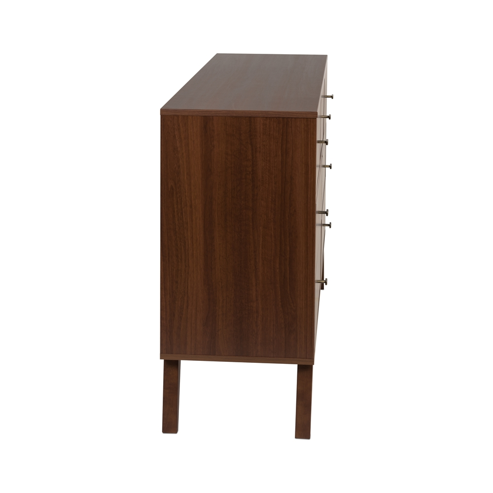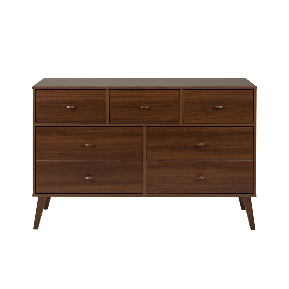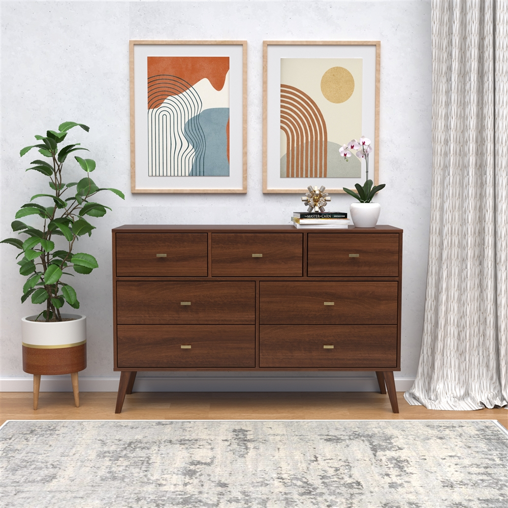 The Prepac Milo 7-drawer dresser is a modern take on a retro look, with a sleek mid-century modern design that adds a touch of vintage to your bedroom. Three small drawers on the top row are well suited for personal clothing, while the 4 large lower drawers have ample room for sweaters and larger items. All seven drawers run smoothly on metal glides, offering easy access to storage for clothing and bedroom items. The tapered solid wood legs and inset drawers deliver a clean and modern look to your bedroom. Brushed brass finished knobs add to the retro-chic design for a functional and fashionable dresser. Style this dresser on its own, or combine it with any of the products in the Milo collection for a timeless look.