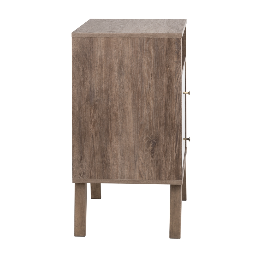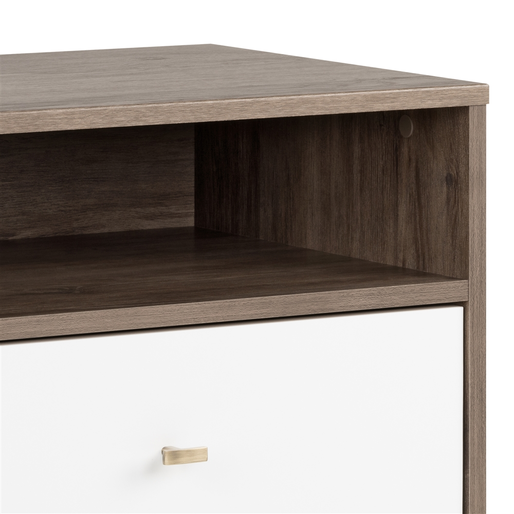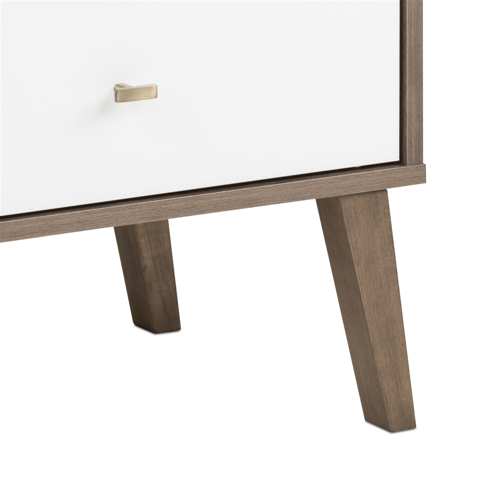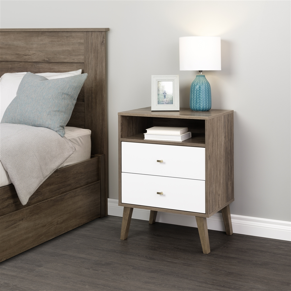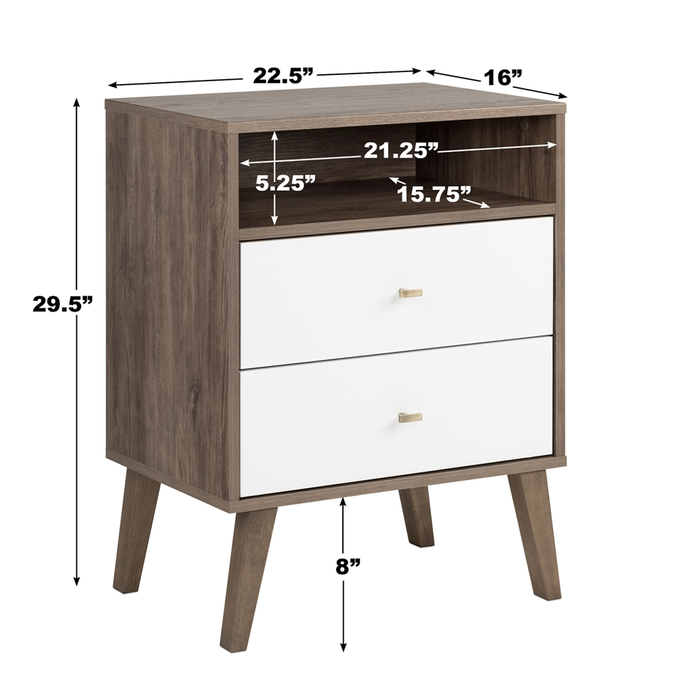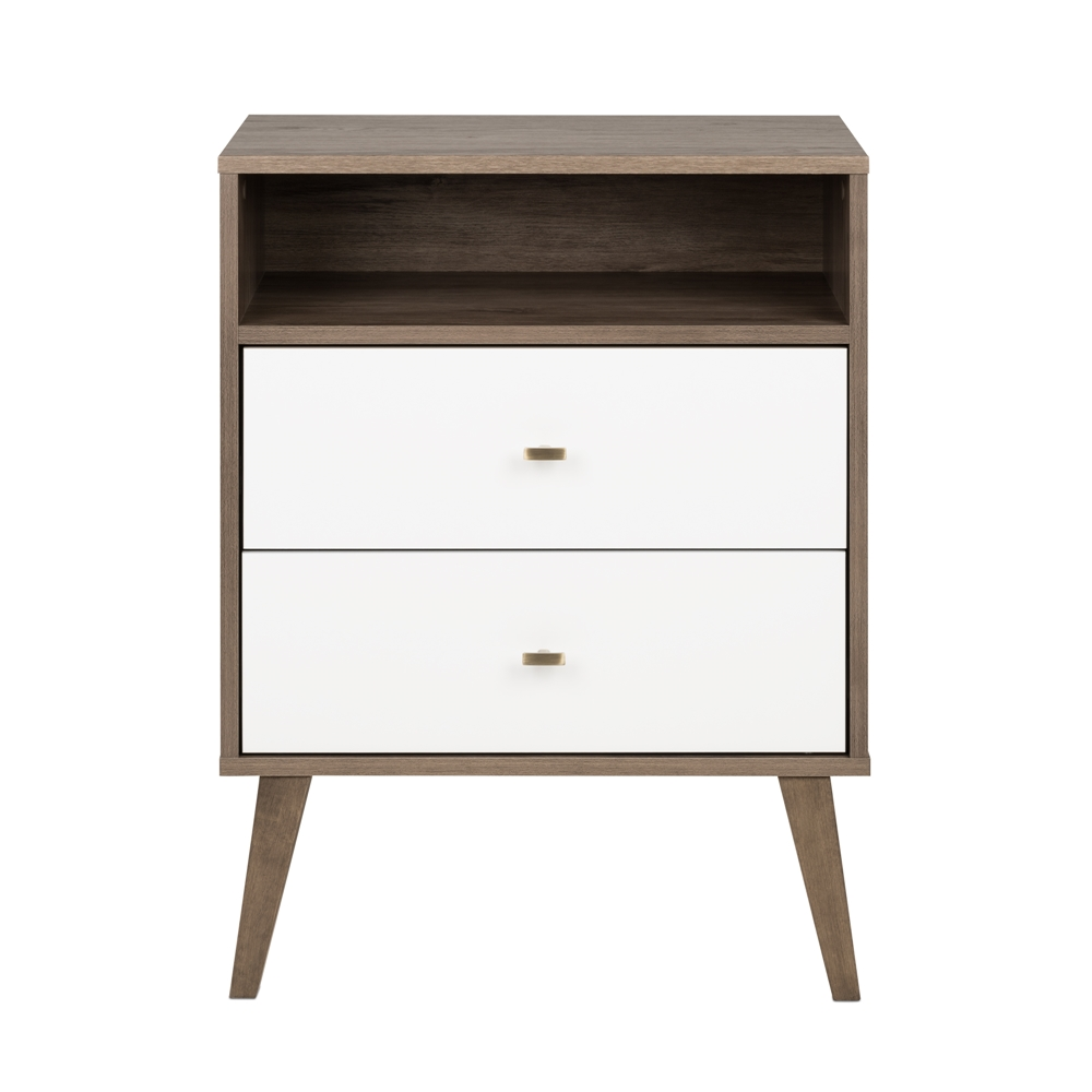 The Prepac Milo 2-drawer nightstand with open shelf is a modern take on a retro look. The sleek mid-century modern design adds a touch of vintage styling to your bedroom while the combination of white and drifted grey adds a contemporary feel which can easily complement nearly any color palette. Two full sized drawers provide ample room for all your bedside necessities and the open shelf is perfect spot for books, devices and glasses. The tapered solid wood legs and brushed brass finished knobs add to the retro-chic design of this functional and fashionable nightstand. Style this nightstand on its own, or combine it with any of the products in the Milo collection for a timeless look.