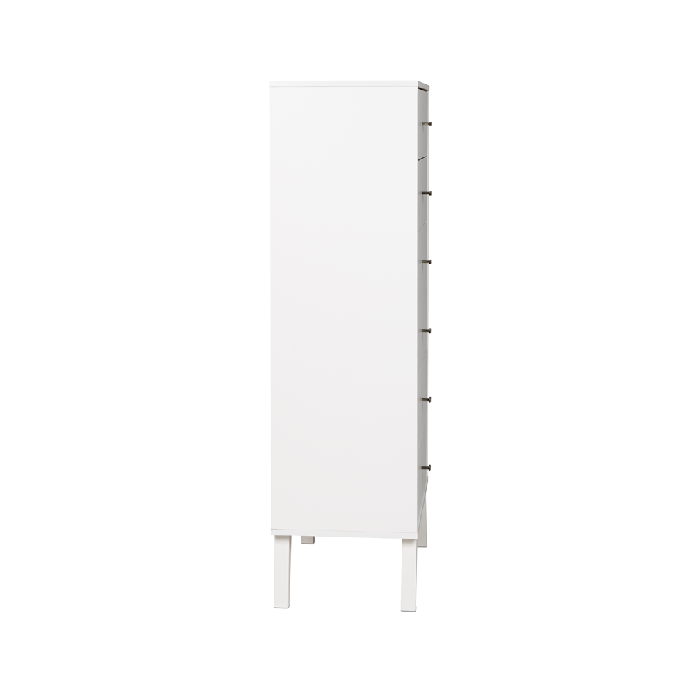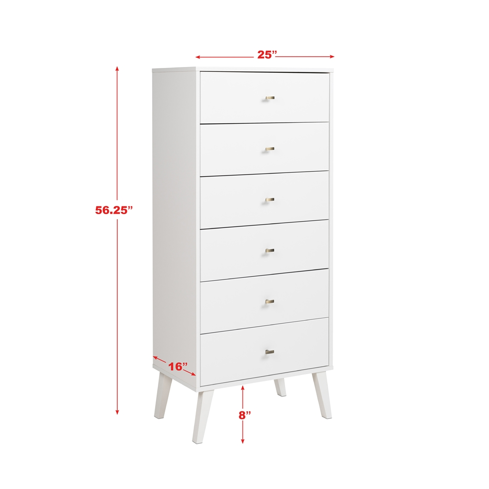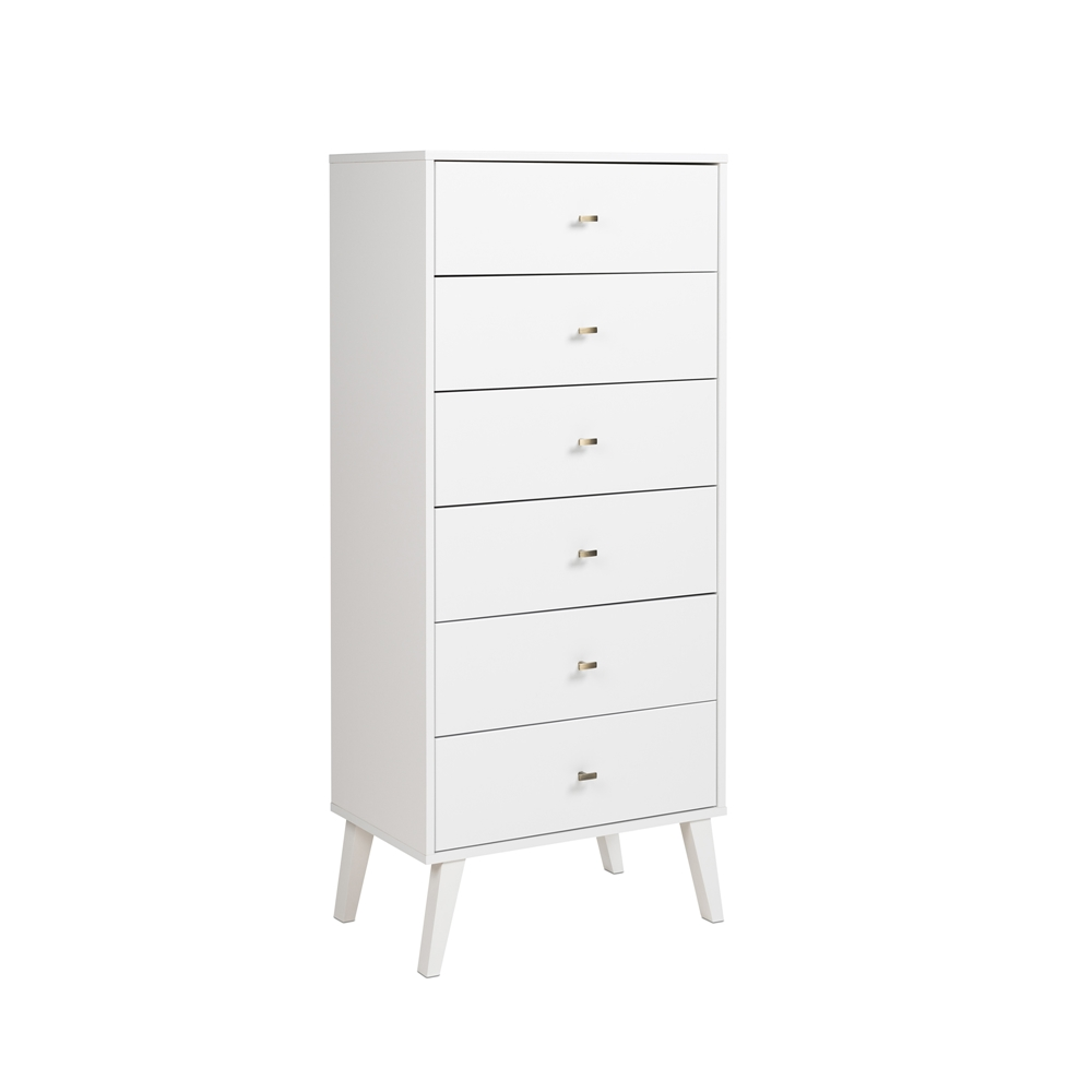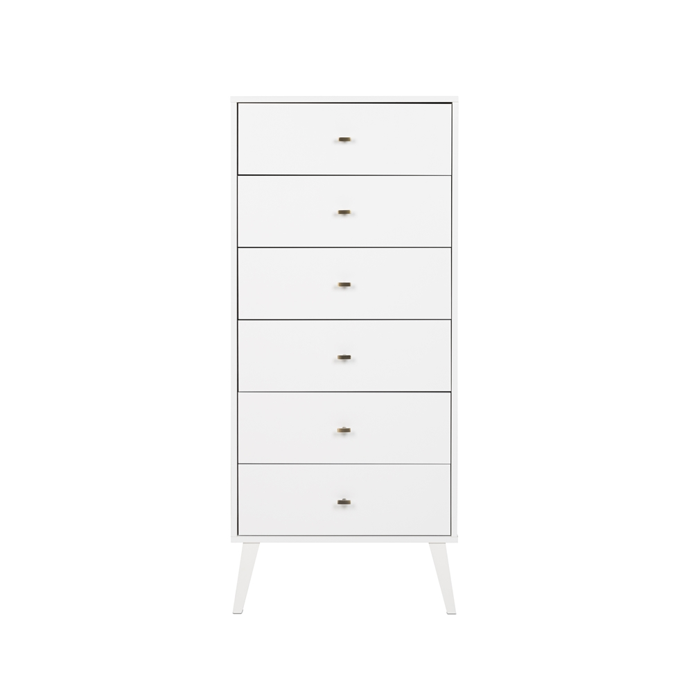 Add a vintage touch to your bedroom with this chest by Prepac(R). Its narrow, space saving design provides maximum storage in the smallest footprint, making it a great fit for condos and smaller spaces. Six drawers run smoothly on metal glides, offering easy access to storage for clothing and bedroom items. The tapered solid wood legs and inset drawers deliver a clean and modern look to your bedroom. Brushed brass finished knobs add to the retro-chic design for a functional and fashionable dresser. Style this dresser on its own, or combine it with any of the products in the Milo collection for a timeless look.