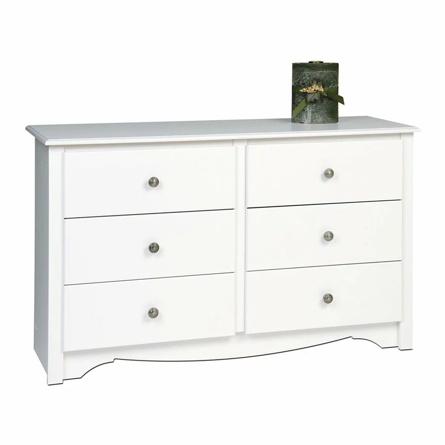 - Detailed with curved top edges, side moldings, a scalloped base panel, and solid dark pewter knobs