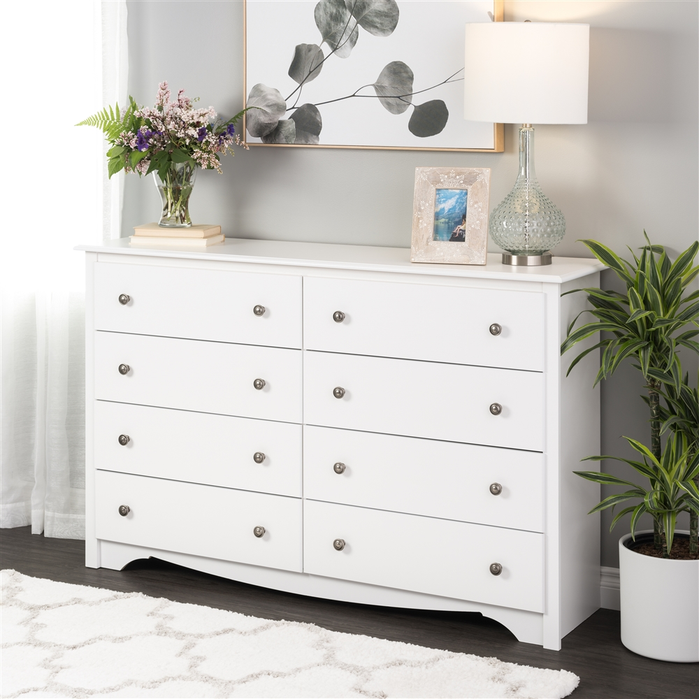 The always-in-style Monterey collection has an everlasting appeal. Now there is an 8-drawer dresser available! As a shared item for partners in the master bedroom or a way to organize a teenager’s fashion addiction, it’s a great addition for any bedroom. Keep a separate drawer for t-shirts, shorts, jeans, sweaters, socks, underwear, and still have two more! Or put it in a spare bedroom to keep extra linens – or more clothes. There is enough space on the 59-in wide top for a lamp, a few books and some collectibles. Coordinate with other furniture pieces in the Monterey collection. Constructed from non-toxic, CARB-2 compliant, laminated composite woods. Ships ready to assemble, includes an instruction booklet for easy assembly and has a 5-year manufacturer’s limited parts warranty. Manufactured in Canada and meets all North American safety standards.