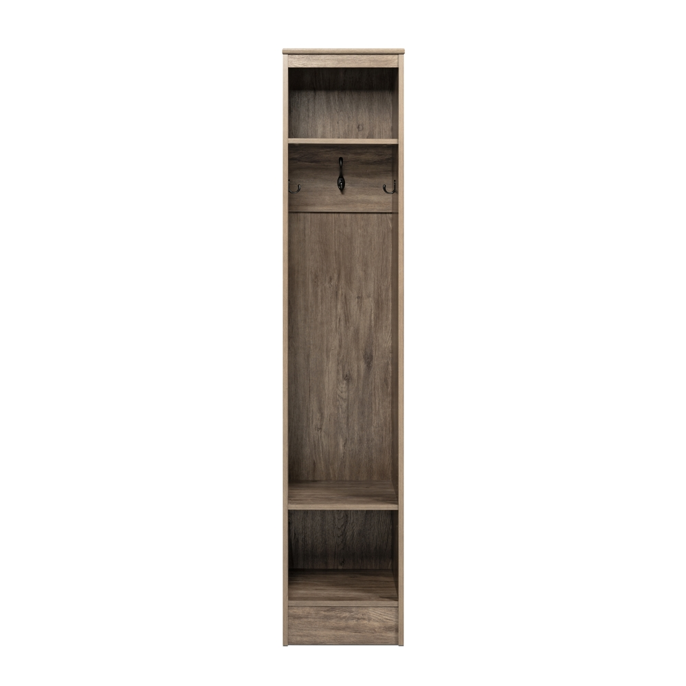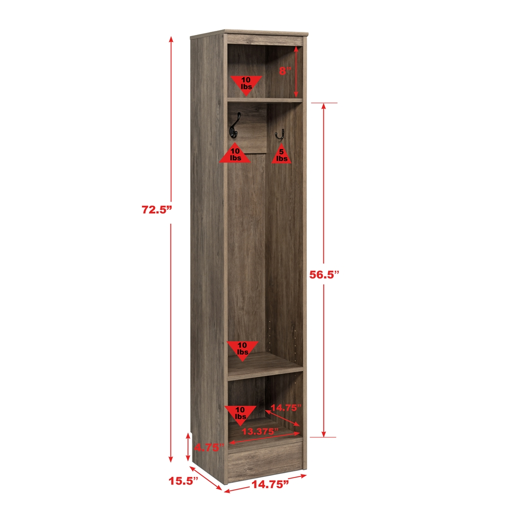 This entryway organizer by Prepac(R) is a great addition to any family room, recreation room or mudroom. Ideal for growing families, you can use a single organizer, or group multiple products together to create a built-in look. The tall compartment is 56½” high and has a lower shelf that can be adjusted to eight different heights. One large double hook on the rear, reinforced panel and a single hook on each of the side panels allow ample room for hanging items. A fixed shelf with an 8”high compartment on top is spacious enough for decorative baskets, hats, and small bags. Each side panel has 5” high cutouts to accommodate baseboards.