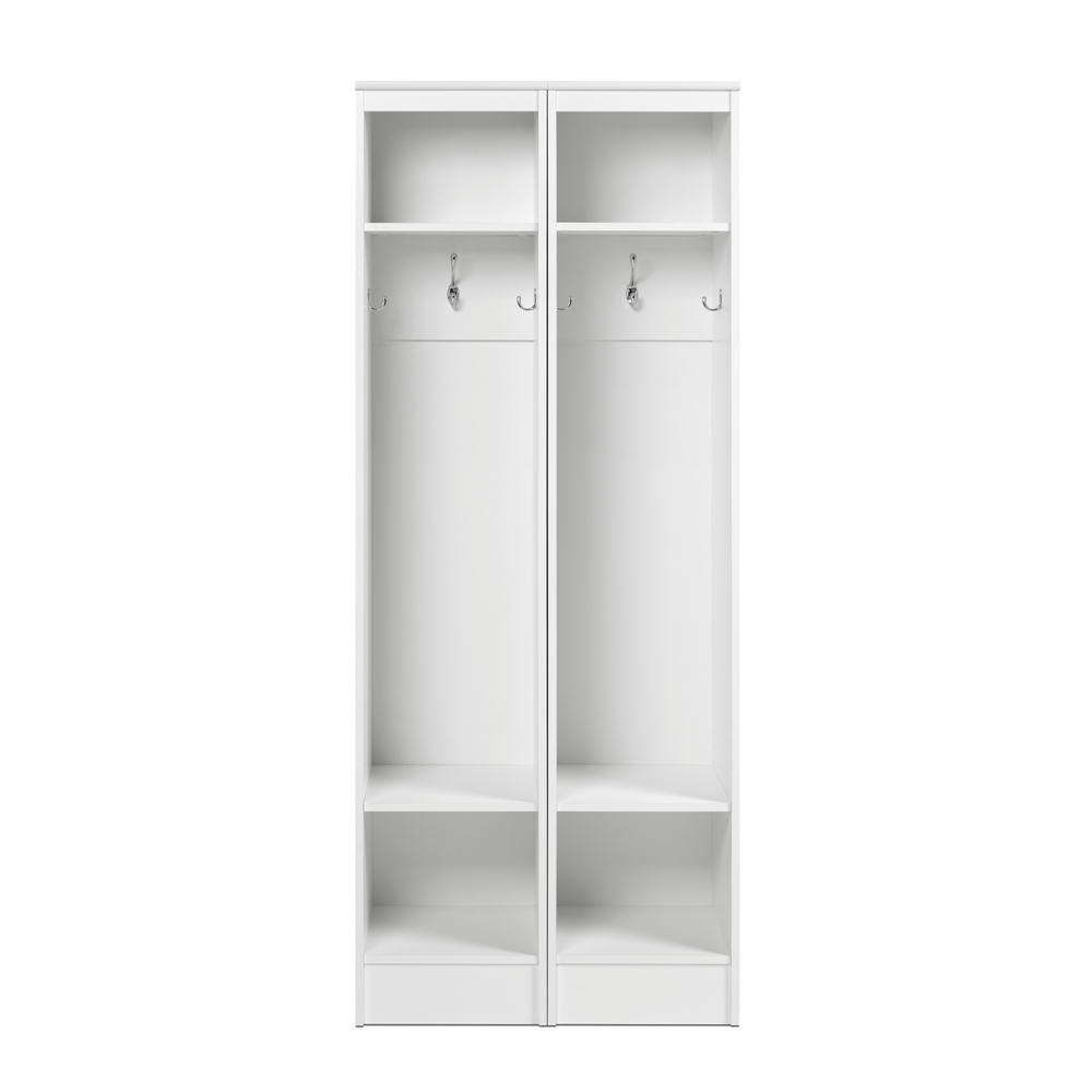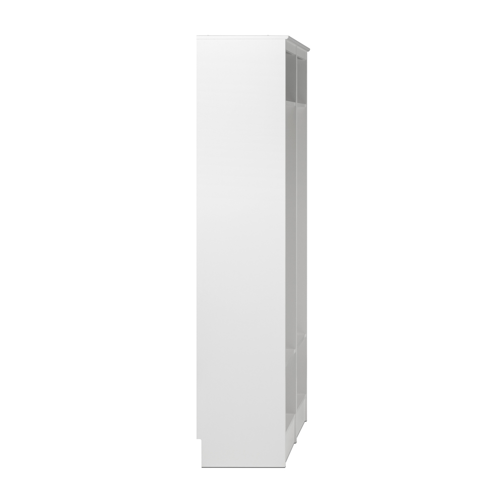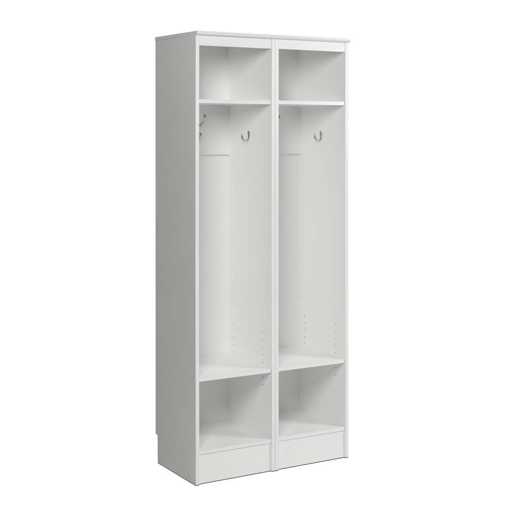 This entryway organizer by Prepac(R) is a great addition to any family room, recreation room or mudroom. Ideal for growing families, you can use organizers individually or position them side-by-side to create a built-in look. Each organzier is designed for maximum functionality. The tall compartment is 56.5” high and has a lower shelf that can be adjusted to eight different heights. One large double hook on the rear, reinforced panel and a single hook on each of the side panels allow ample room for hanging items. A fixed shelf on top with an 8” high compartment is spacious enough for decorative baskets, hats, and small bags. Each side panel has 4.75” high cutouts to accommodate baseboards.