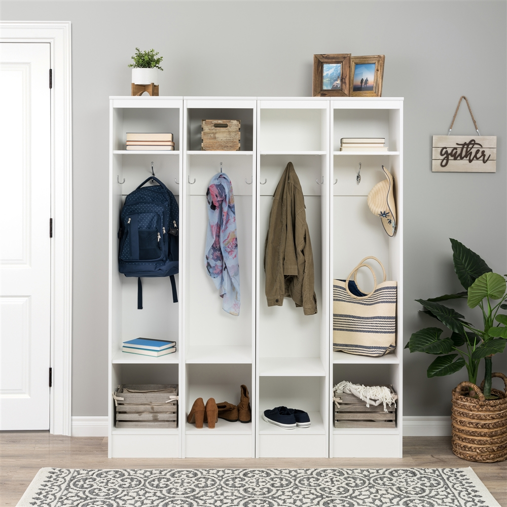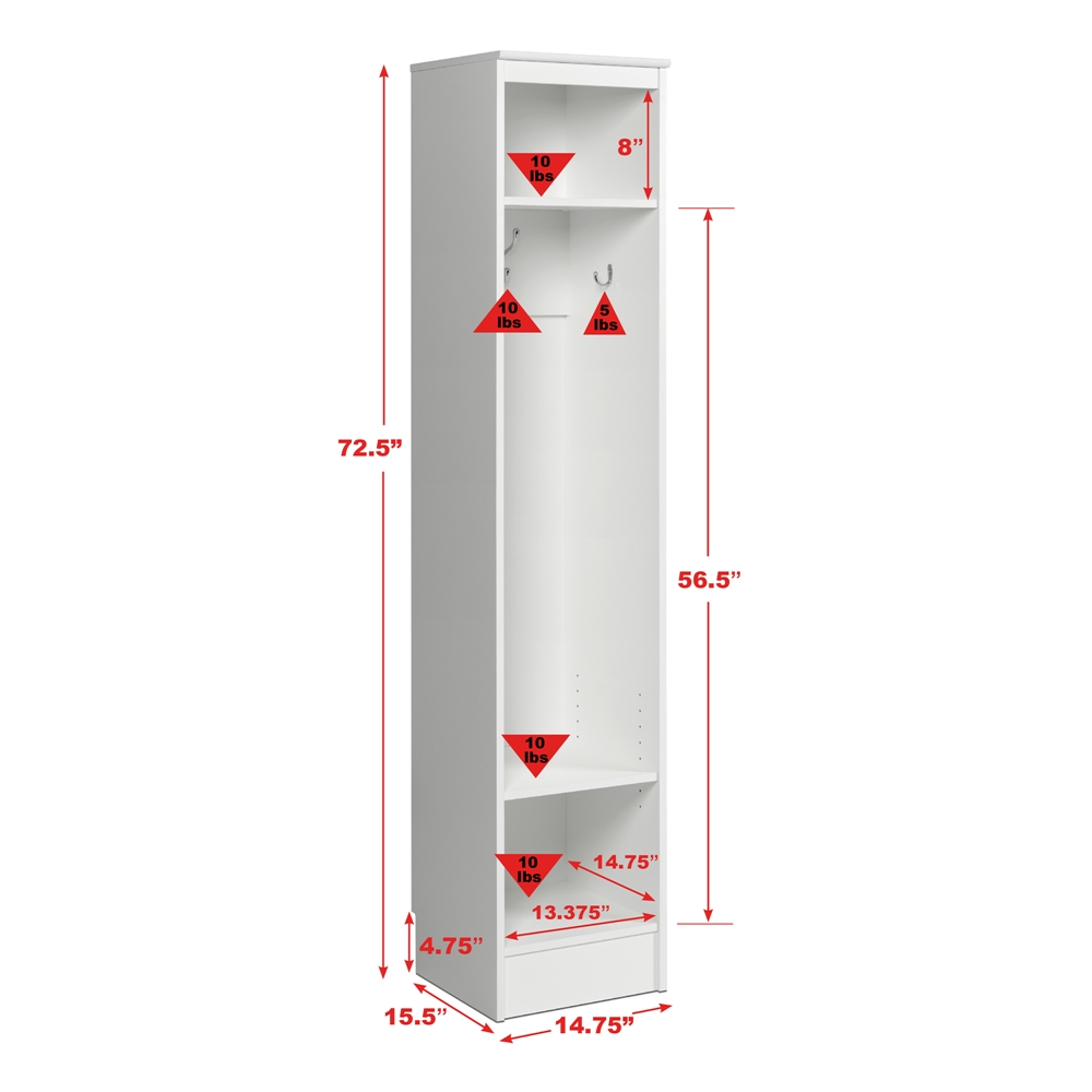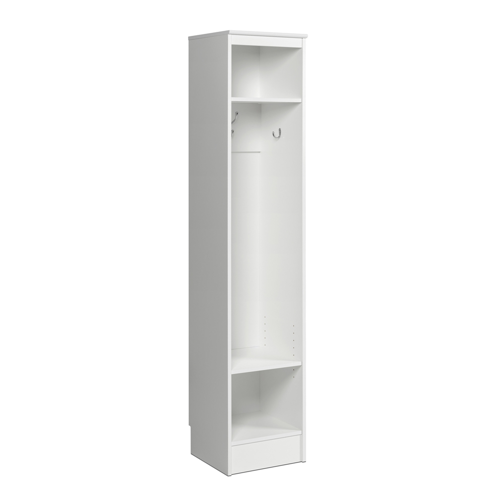 This entryway organizer by Prepac(R) is a great addition to any family room, recreation room or mudroom. Ideal for growing families, you can use a single organizer, or group multiple products together to create a built-in look. The tall compartment is 56½” high and has a lower shelf that can be adjusted to eight different heights. One large double hook on the rear, reinforced panel and a single hook on each of the side panels allow ample room for hanging items. A fixed shelf with an 8”high compartment on top is spacious enough for decorative baskets, hats, and small bags. Each side panel has 5” high cutouts to accommodate baseboards.