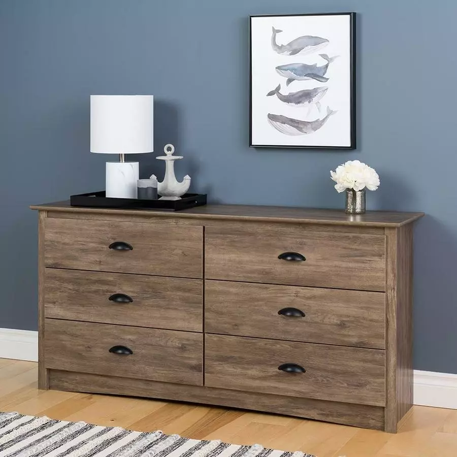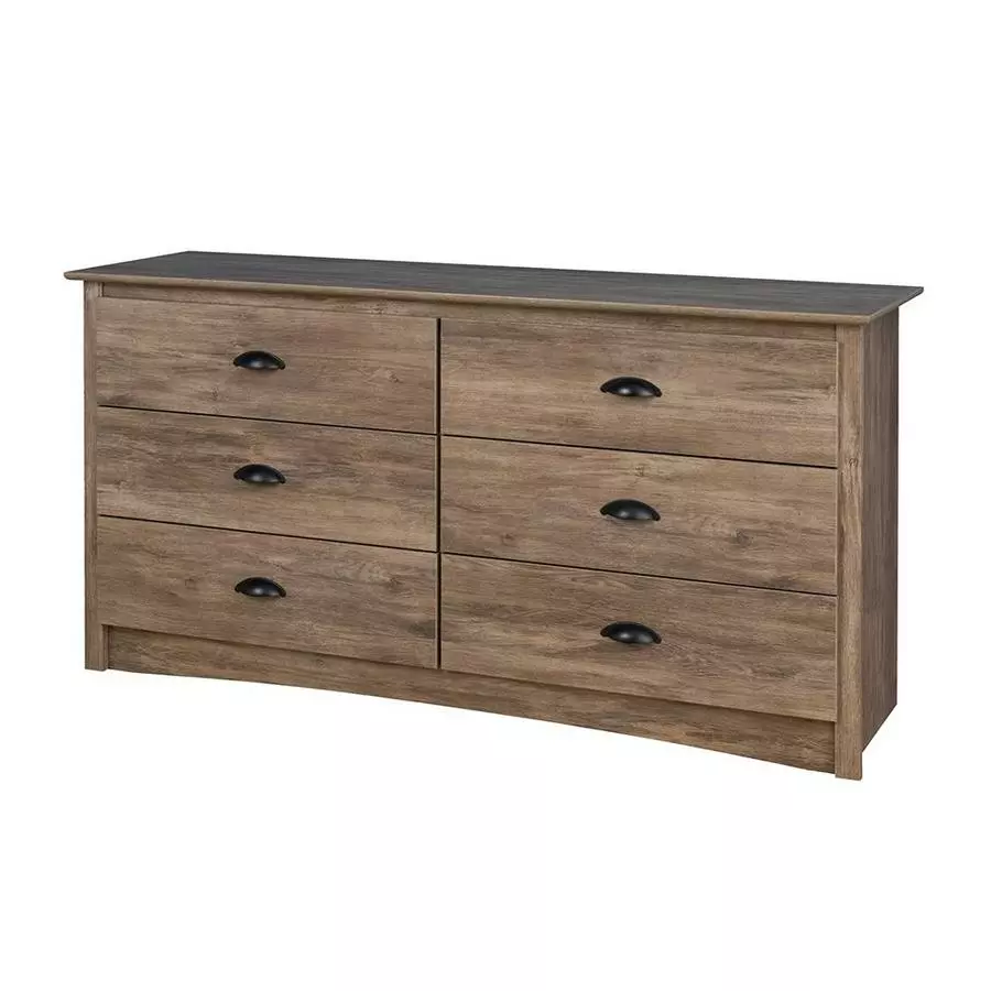 - The drifted gray laminate finish adds a hint of warm coastal style, and the black metal hooded handles add a vintage touch