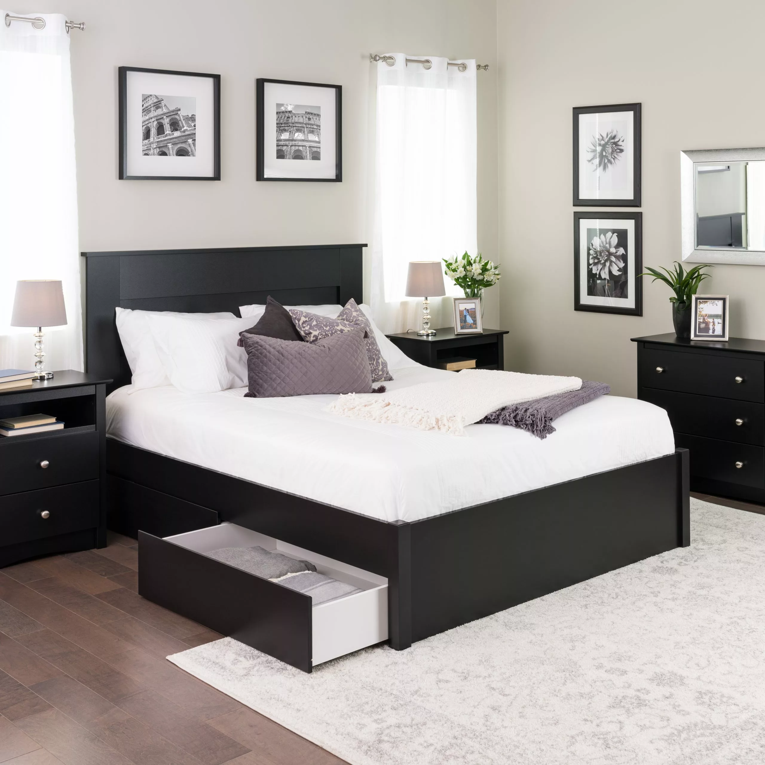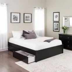 Add storage, style and comfort to your bedroom with the Prepac Select 4-Post Platform Bed. The elegant design features solid wood posts with a sleek finished bed frame. Custom hardware keeps the bed aligned and requires only your mattress. The wood slats system, which comes in two sections, prevents motion transfer to provide individual comfort. The platform is raised 8.5 inches in height which allows for optional under-bed storage. Two large drawers add storage functionality to the Select Platform Bed. Drawers can be added to either side of the bed. Each large roll out drawer (38″”W x 5.5″”H x 23″”D) offers plenty of storage space for your blankets, linens, clothes or pillows. Five caster wheels allow you to roll these extra-large drawers to reach your belongings with ease.