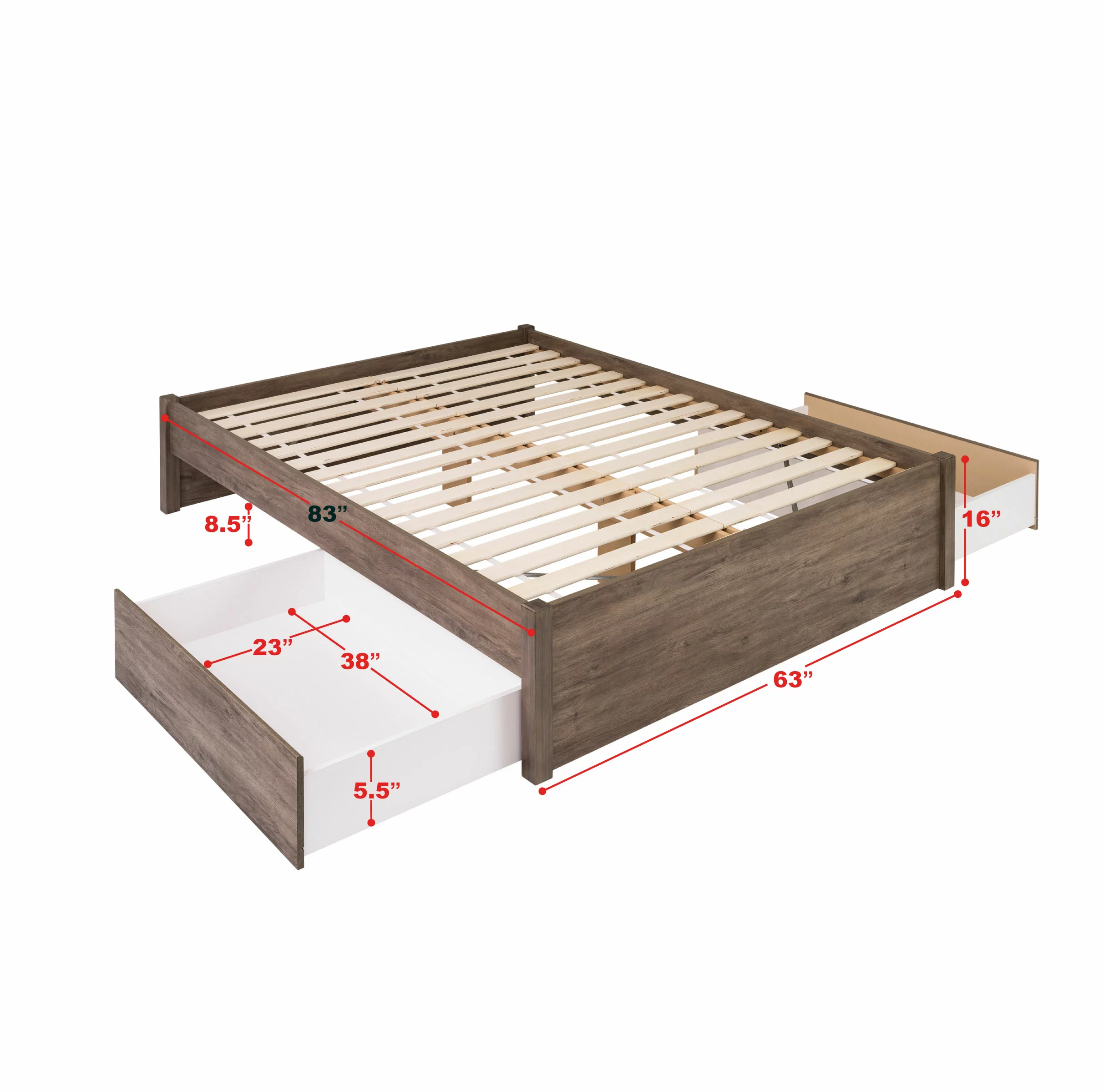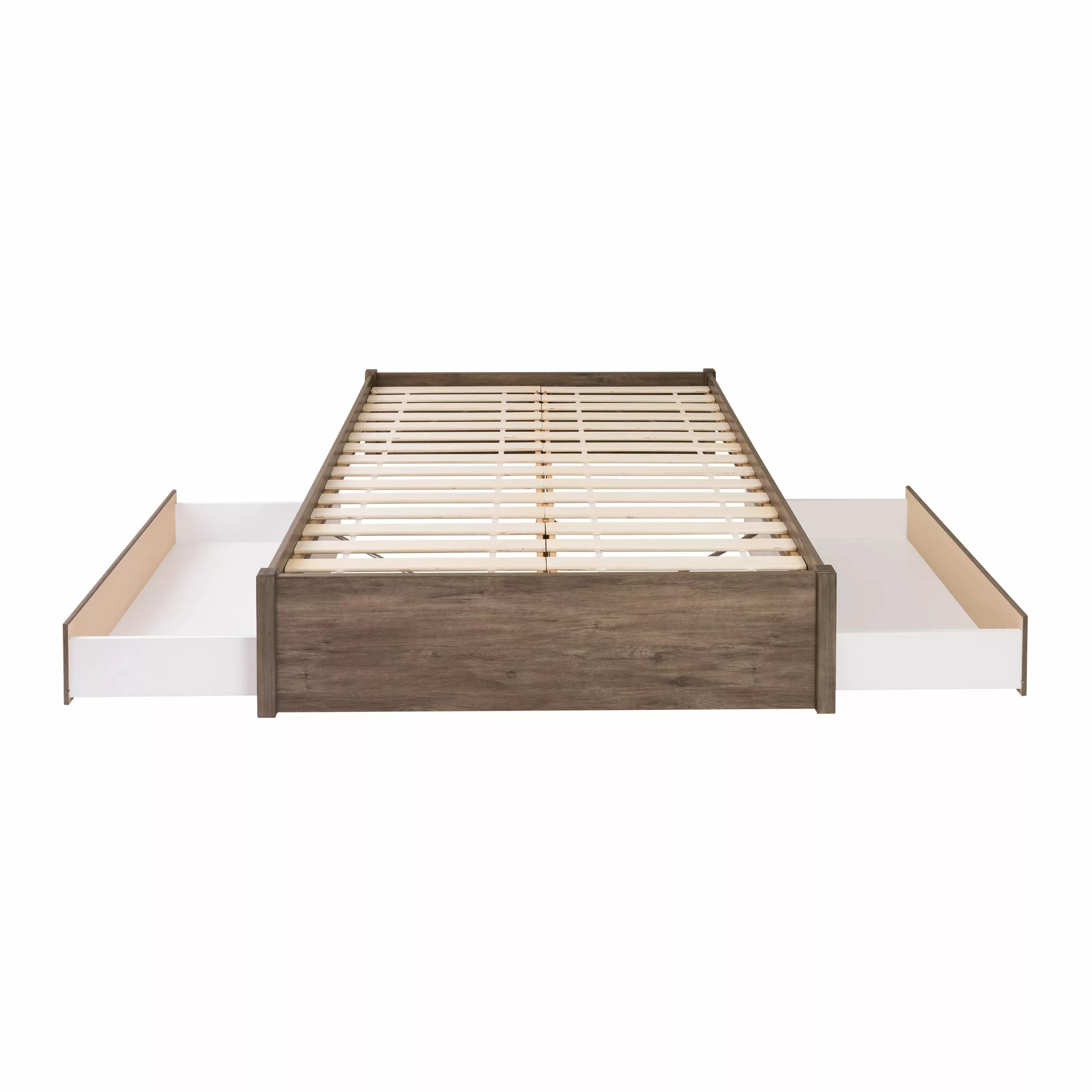 Add storage, style and comfort to your bedroom with the Prepac Select 4-Post Platform Bed. The elegant design features solid wood posts with a sleek finished bed frame. Custom hardware keeps the bed aligned and requires only your mattress. The wood slat system, which comes in two sections, prevents motion transfer to provide individual comfort. The platform is raised 8.5 inches in height which allows for optional under bed storage. Two large drawers add storage functionality to the Select Platform Bed. Drawers can be added to either side of the bed. Each large roll out drawer (38″”W x 5.5″”H x 23″”D) offers plenty of storage space for your blankets, linens, clothes or pillows. Five caster wheels allow you to roll these extra-large drawers to reach your belongings with ease.