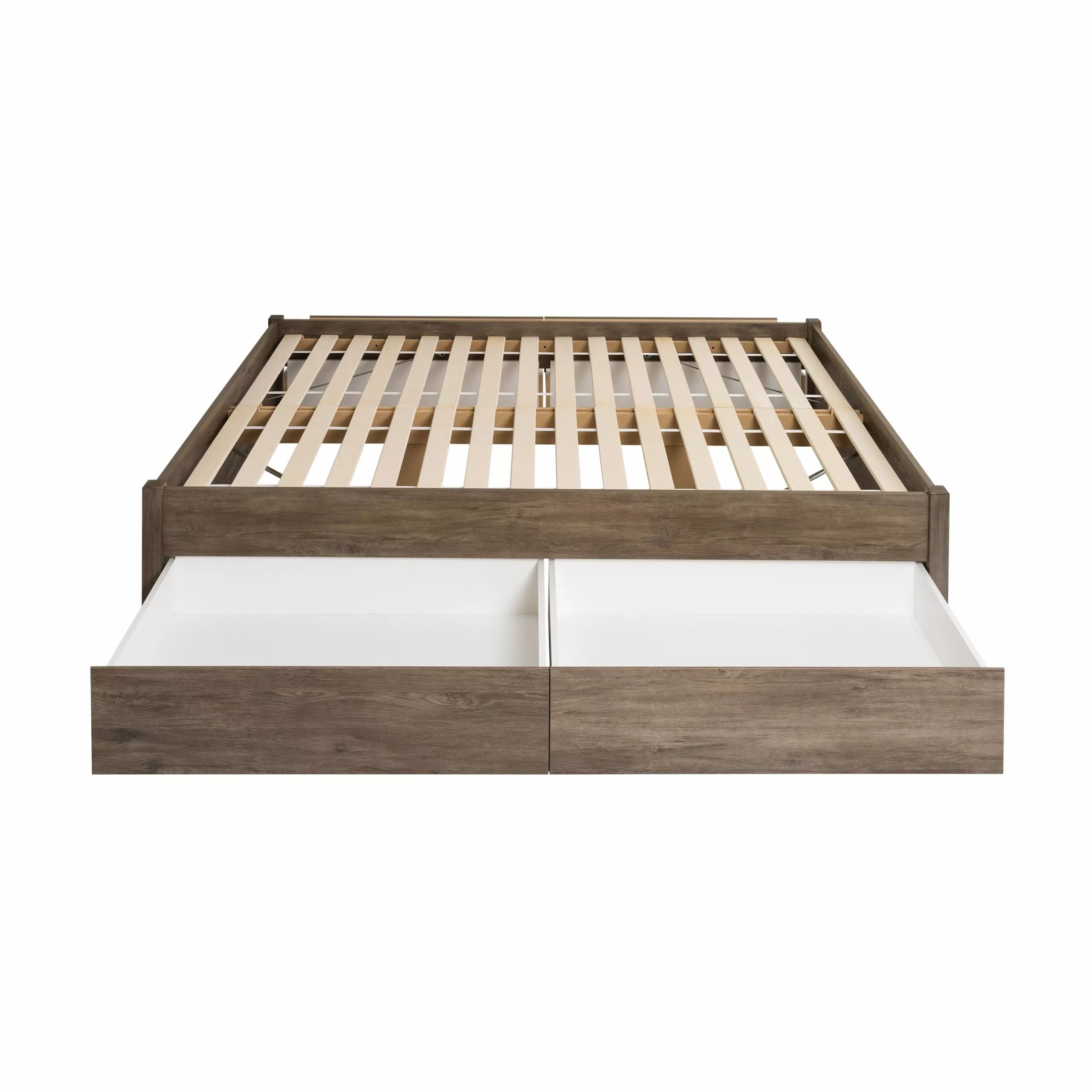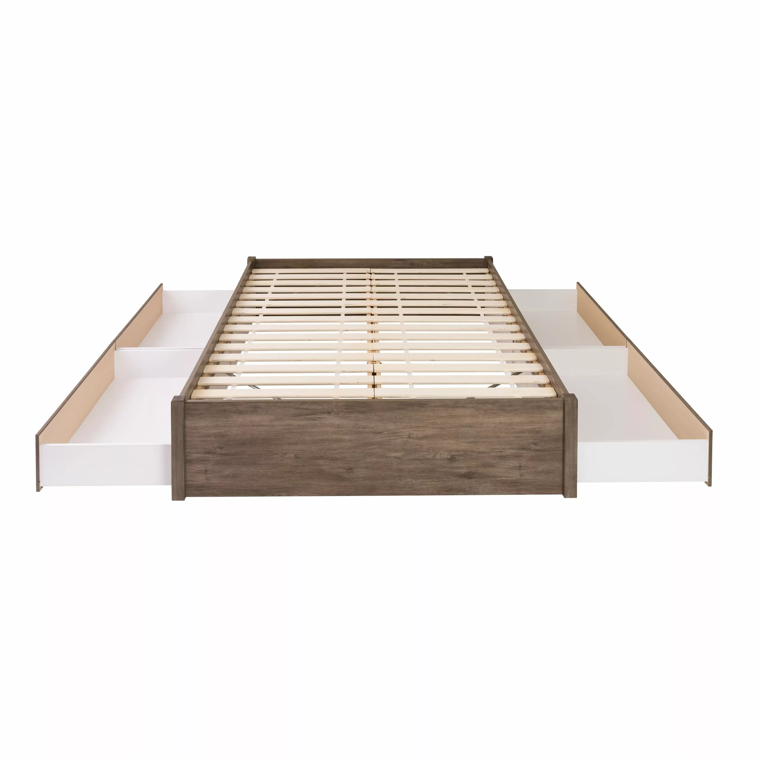 Add storage, style and comfort to your bedroom with the Prepac Select 4-Post Platform Bed. The elegant design features solid wood posts with a sleek finished bed frame. Custom hardware keeps the bed aligned and requires only your mattress. The wood slat system, which comes in two sections, prevents motion transfer to provide individual comfort. The platform is raised 8.5 inches which allows for optional under bed storage. Four large drawers add storage functionality to the Select Platform Bed. Each large roll out drawer (38″”W x 5.5″”H x 23″”D) offers plenty of storage space for your blankets, linens, clothes or pillows. Five caster wheels allow you to roll these extra-large drawers to reach your belongings with ease.