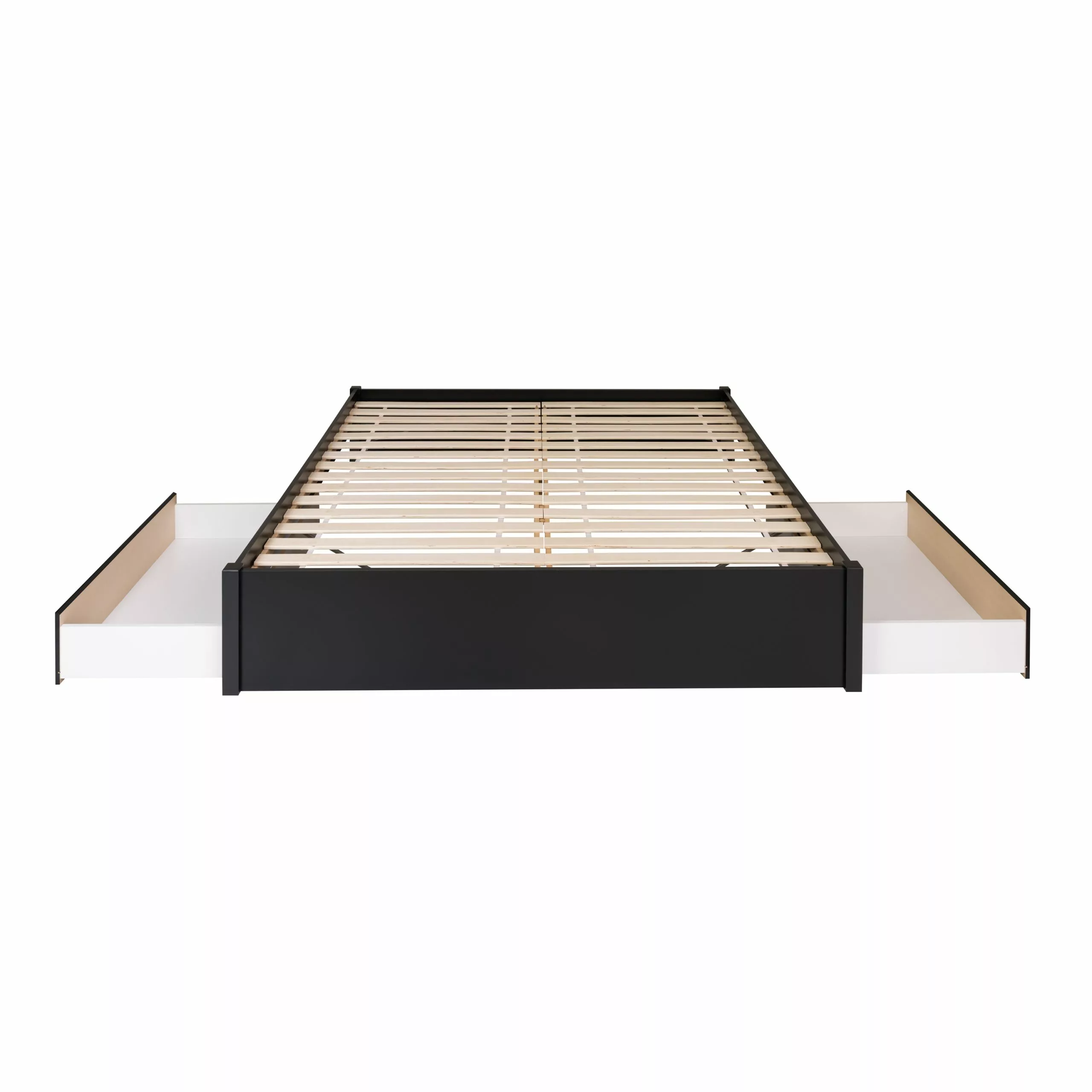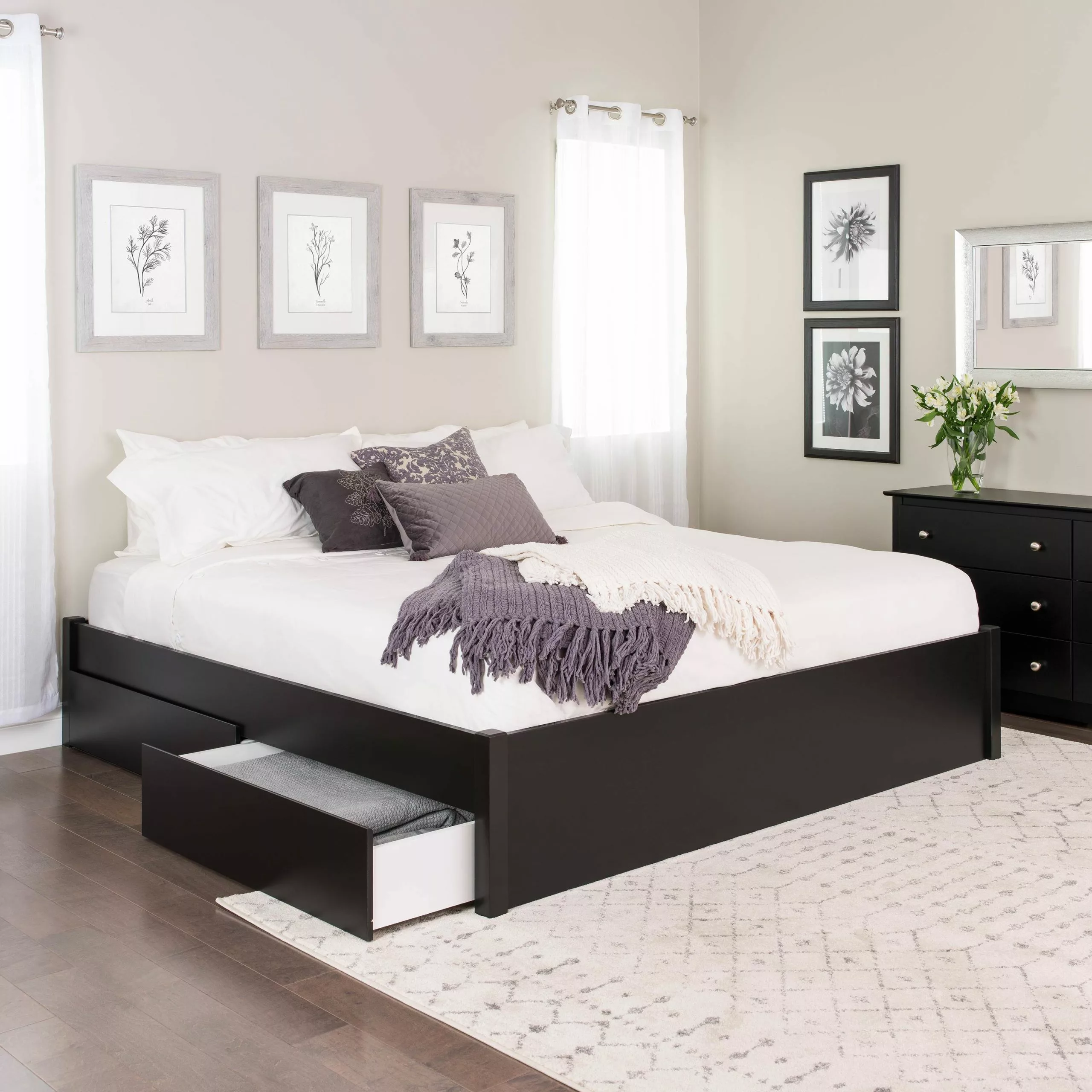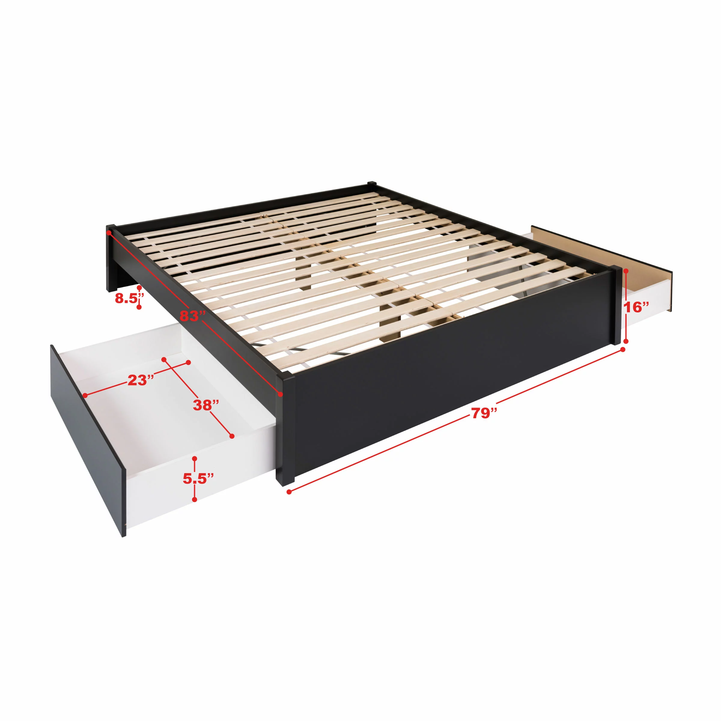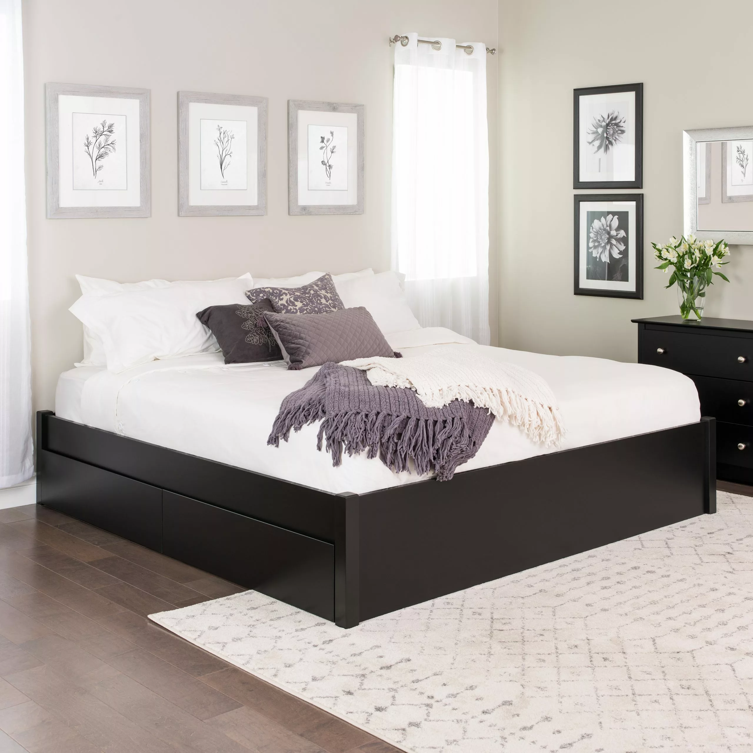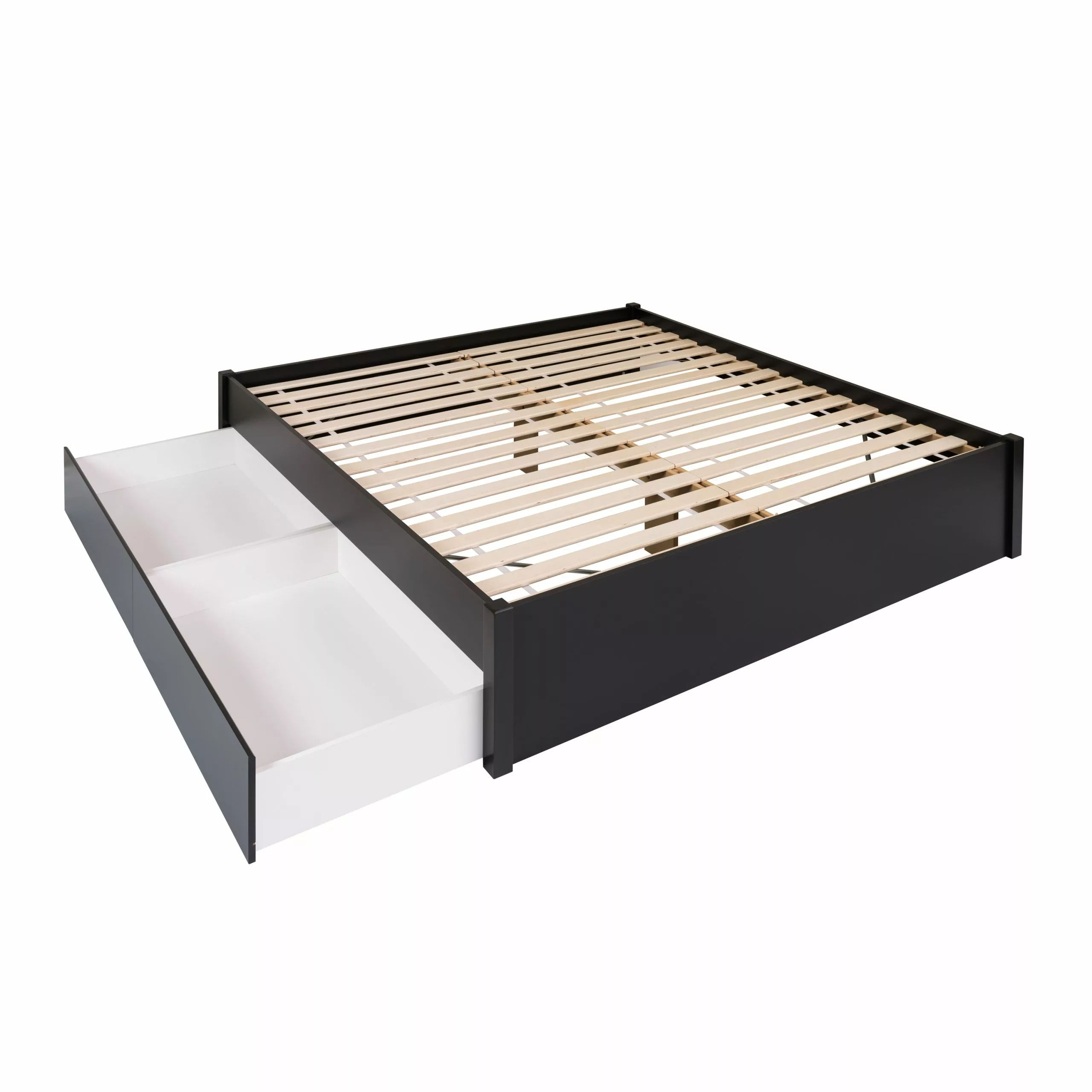Add storage, style and comfort to your bedroom with the Prepac Select 4-Post Platform Bed. The elegant design features solid wood posts with a sleek finished bed frame. Custom hardware keeps the bed aligned and requires only your mattress. The wood slat system, which comes in two sections, prevents motion transfer to provide individual comfort. The platform is raised 8.5 inches in height which allows for optional under bed storage. Two large drawers add storage functionality to the Select Platform Bed. Drawers can be added to either side of the bed. Each large roll out drawer (38″”W x 5.5″”H x 23″”D) offers plenty of storage space for your blankets, linens, clothes or pillows. Five caster wheels allow you to roll these extra-large drawers to reach your belongings with ease.