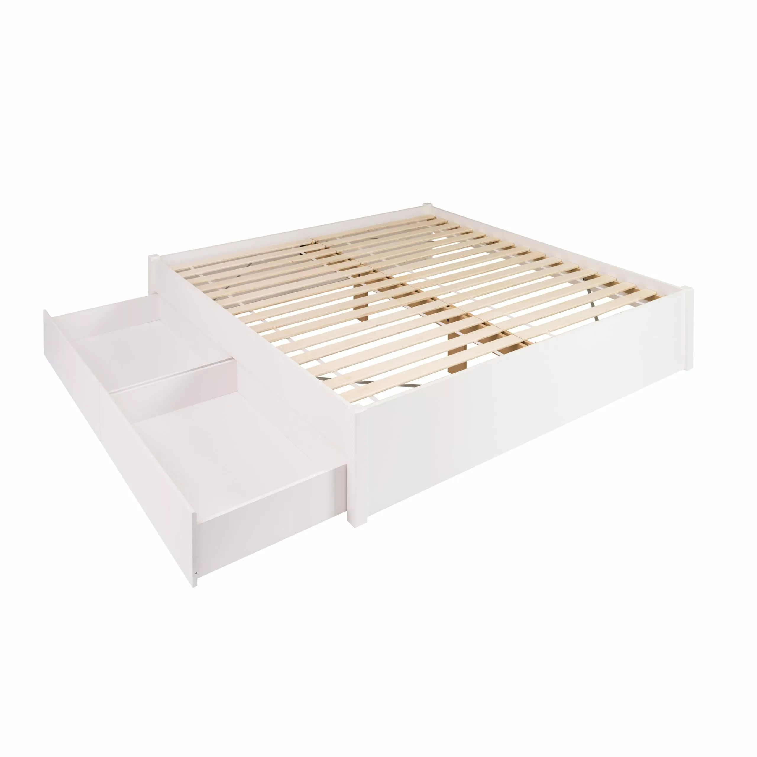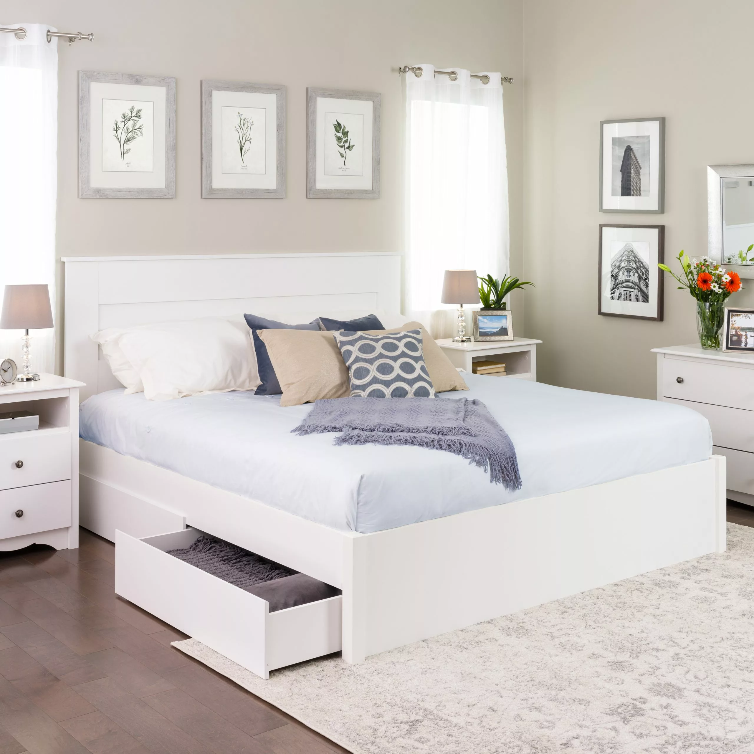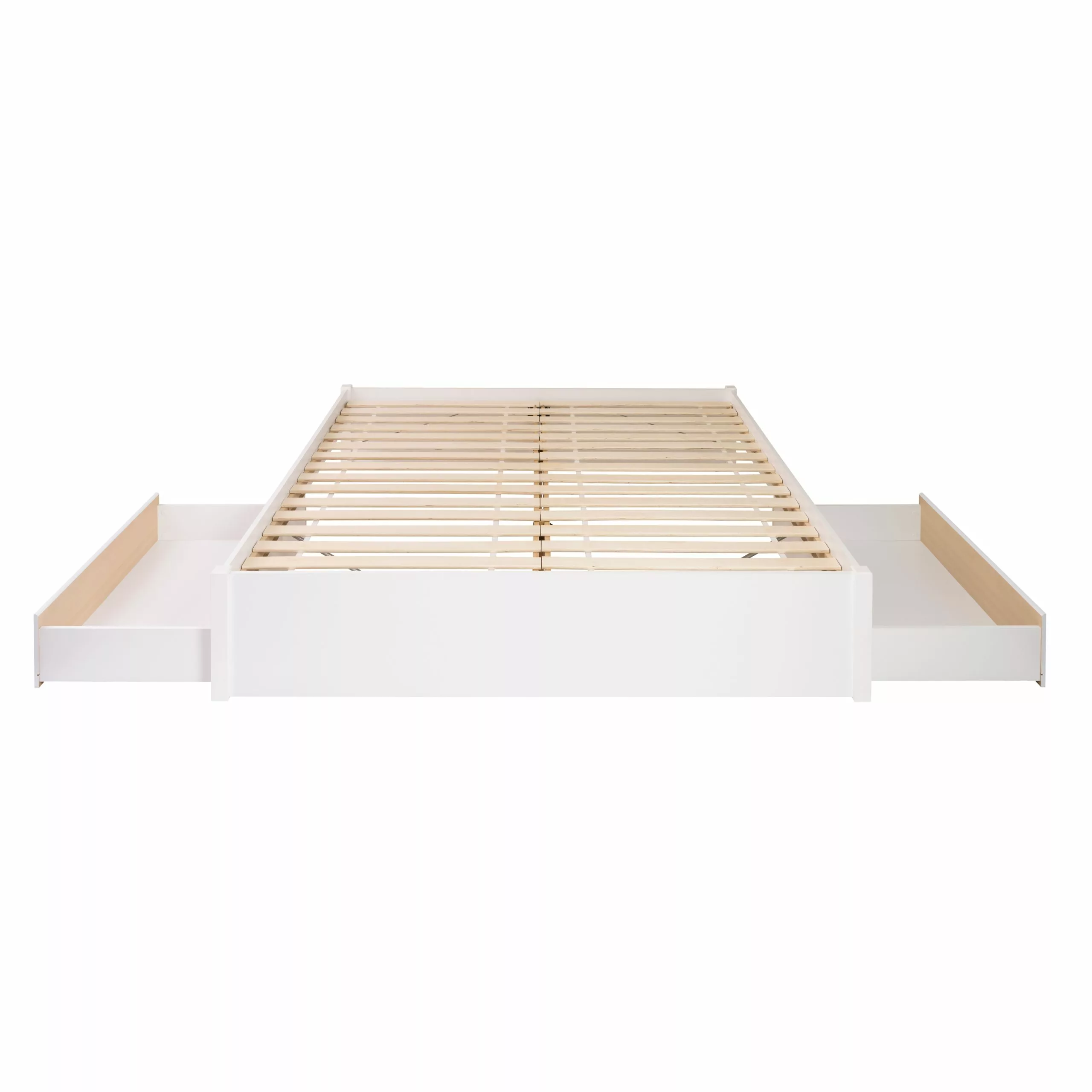Add storage, style and comfort to your bedroom with the Prepac Select 4-Post Platform Bed. The elegant design features solid wood posts with a sleek finished bed frame. Custom hardware keeps the bed aligned and requires only your mattress. The wood slats system, which comes in two sections, prevents motion transfer to provide individual comfort. The platform is raised 8.5 inches in height which allows for optional under-bed storage. Two large drawers add storage functionality to the Select Platform Bed. Drawers can be added to either side of the bed. Each large roll out drawer (38″”W x 5.5″”H x 23″”D) offers plenty of storage space for your blankets, linens, clothes or pillows. Five caster wheels allow you to roll these extra-large drawers to reach your belongings with ease.