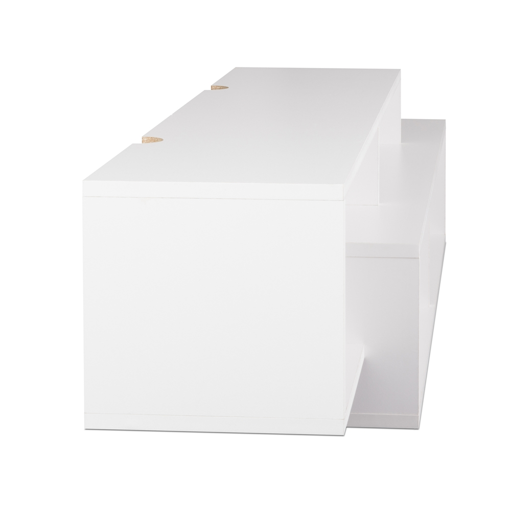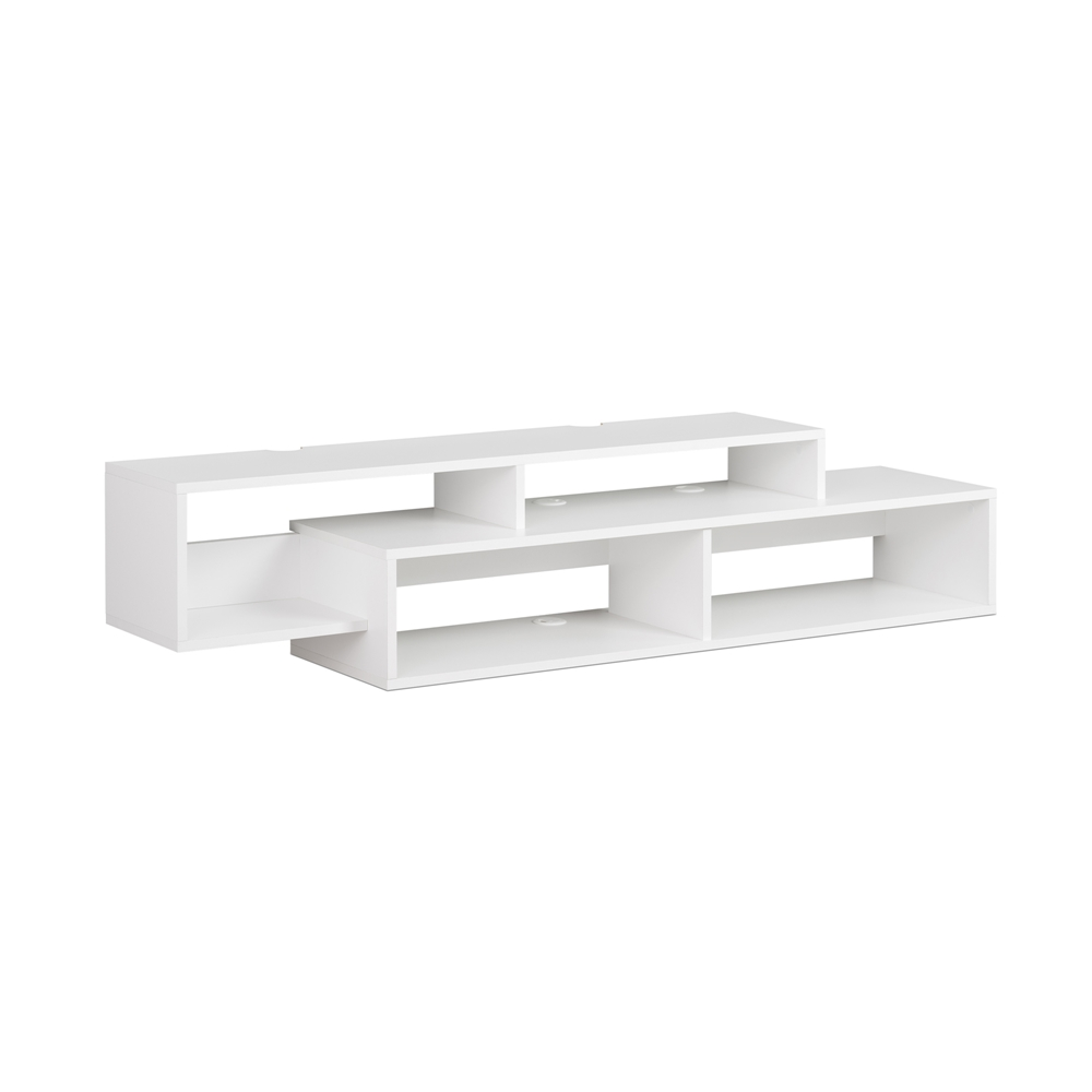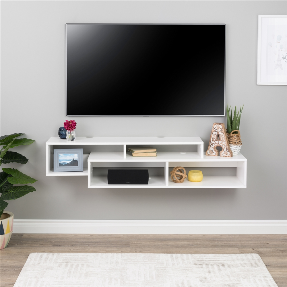 Keep your living space serene with this modern wall-mounted media console and storage shelf that is both modern yet reminiscent of the mid-twentieth century. Mount your TV on the wall above the four staggered compartments which are ideal for today’s assortment of compact electronic devices as well as decorative items like plants or photographs. Each shelf has cutouts so you can keep your cables and wires organized from top to bottom. The console is easy to mount under your TV using an innovative metal rail system. You just need to locate 4 wooden wall studs for mounting. Manufactured in Canada from non-toxic, laminated composite woods and meets all North American safety standards. Ships ready to assemble, includes an instruction booklet for easy assembly and has a 5-year manufacturer’s limited warranty.