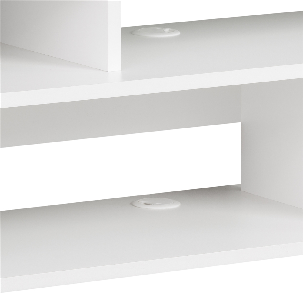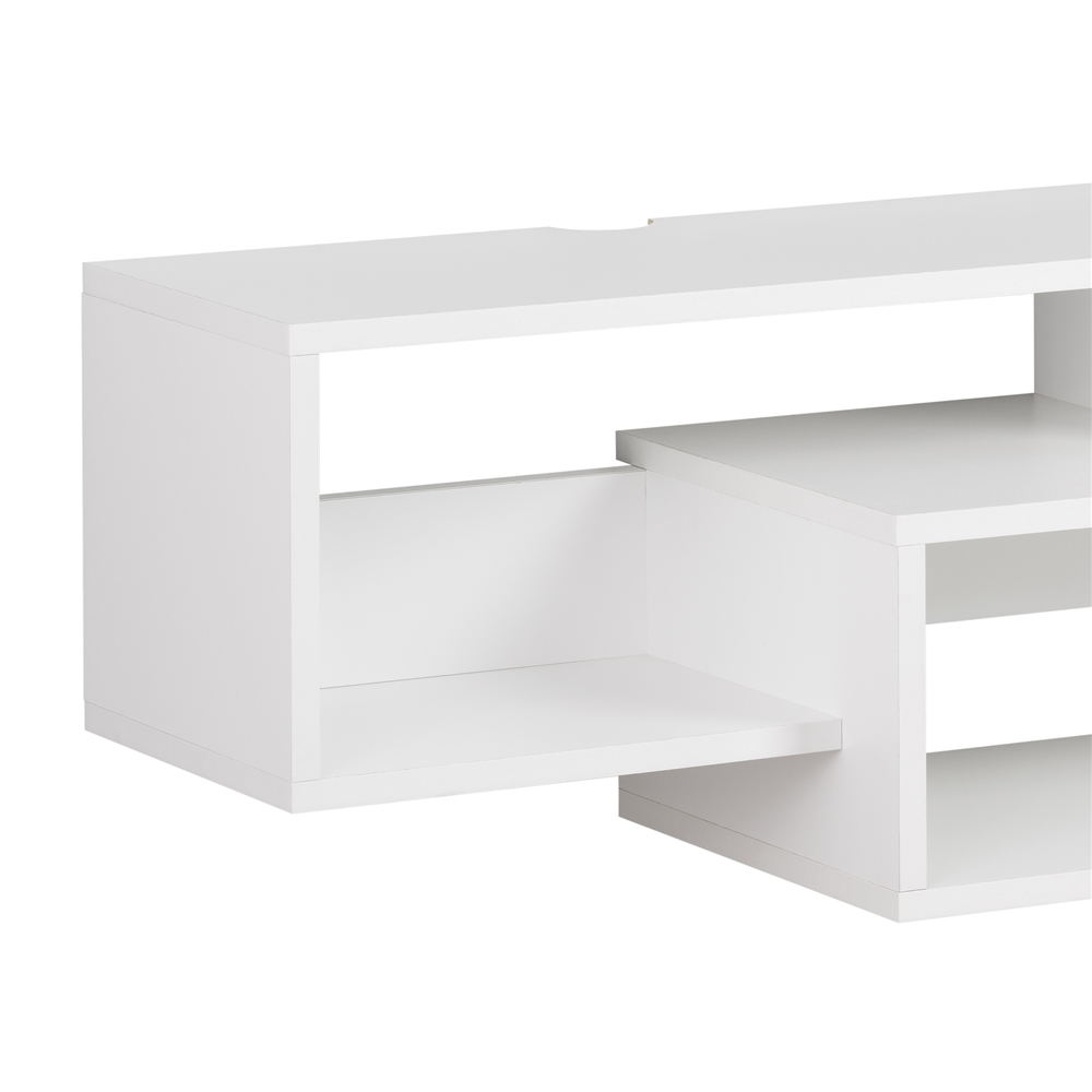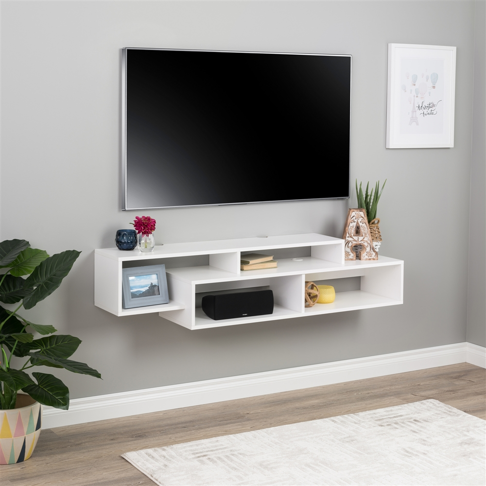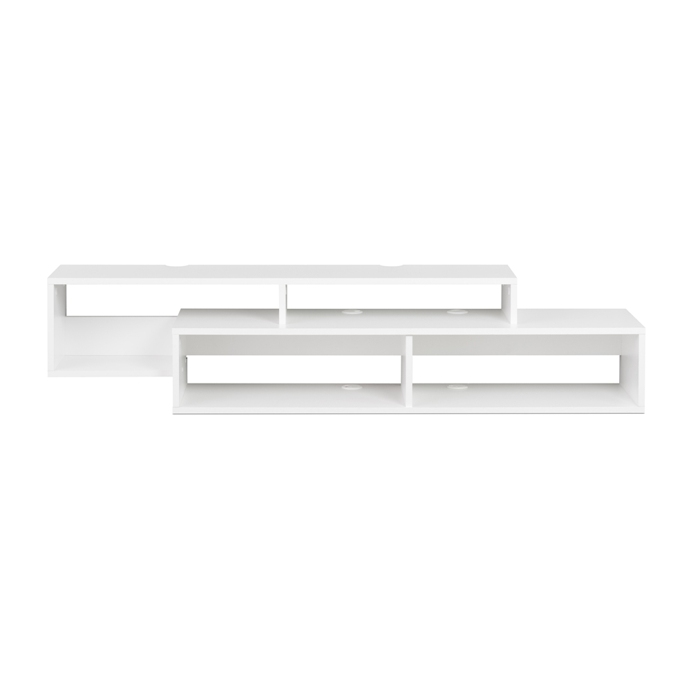 Keep your living space serene with this modern wall-mounted media console and storage shelf that is both modern yet reminiscent of the mid-twentieth century. Mount your TV on the wall above the four staggered compartments which are ideal for today’s assortment of compact electronic devices as well as decorative items like plants or photographs. Each shelf has cutouts so you can keep your cables and wires organized from top to bottom. The console is easy to mount under your TV using an innovative metal rail system. You just need to locate 4 wooden wall studs for mounting. Manufactured in Canada from non-toxic, laminated composite woods and meets all North American safety standards. Ships ready to assemble, includes an instruction booklet for easy assembly and has a 5-year manufacturer’s limited warranty.