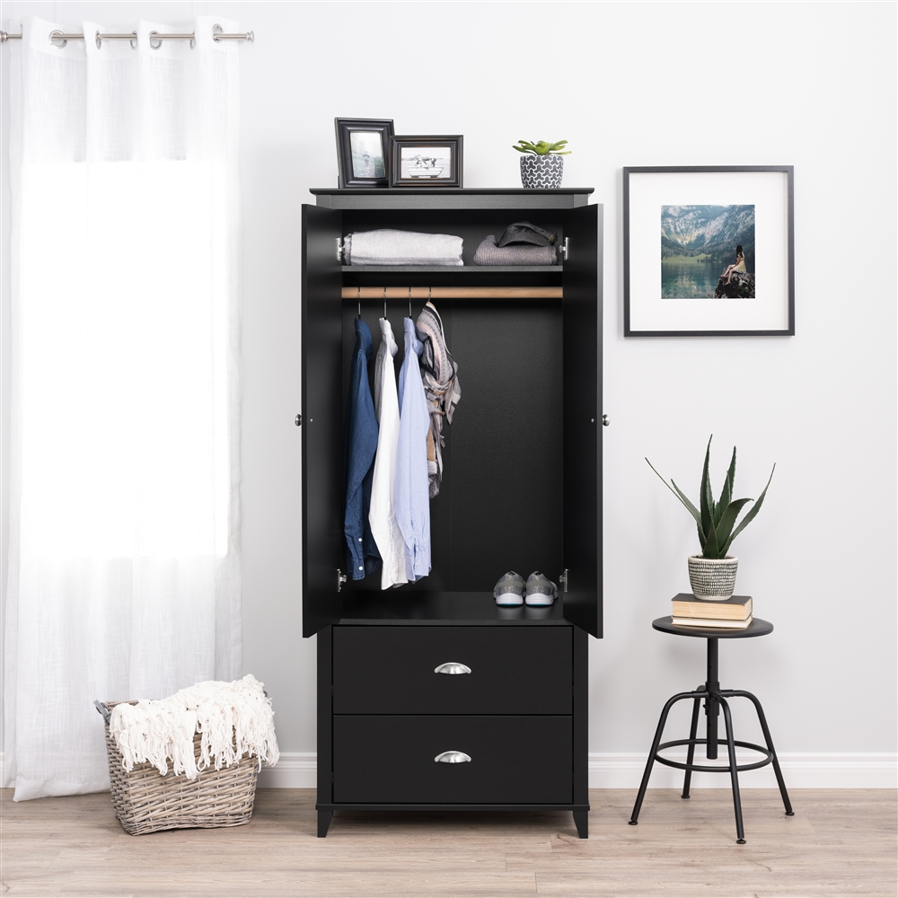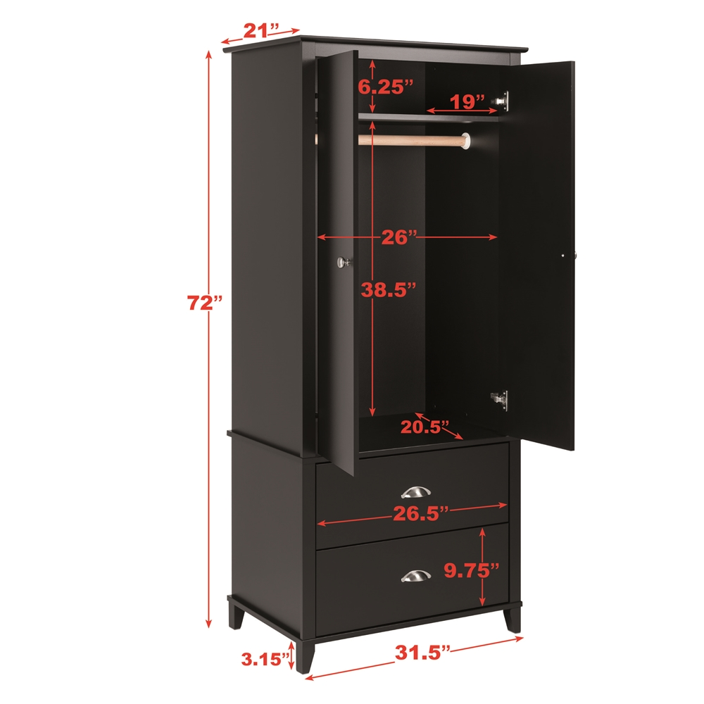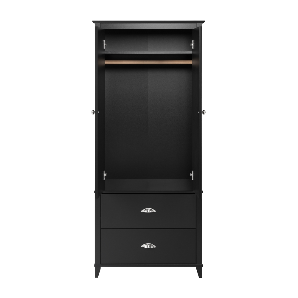 Standing at 72 inches tall, the stylish Prepac Yaletown 2 Door Armoire will fit all your storage needs. The wooden rod behind the double doors is perfect to hang your blazers, coats and shirts, while the shelf above can be used to store linens or accessories. Two large drawers complete this armoire and provide even more storage space to help keep you organized. Decorative moulding and brushed nickel hooded pulls and knobs give the armoire a classic look, while the 4 wooden legs lift the armoire off the ground to create a timeless décor. Combine this armoire with other items in the Prepac Yaletown Bedroom Collection for a complete look.
